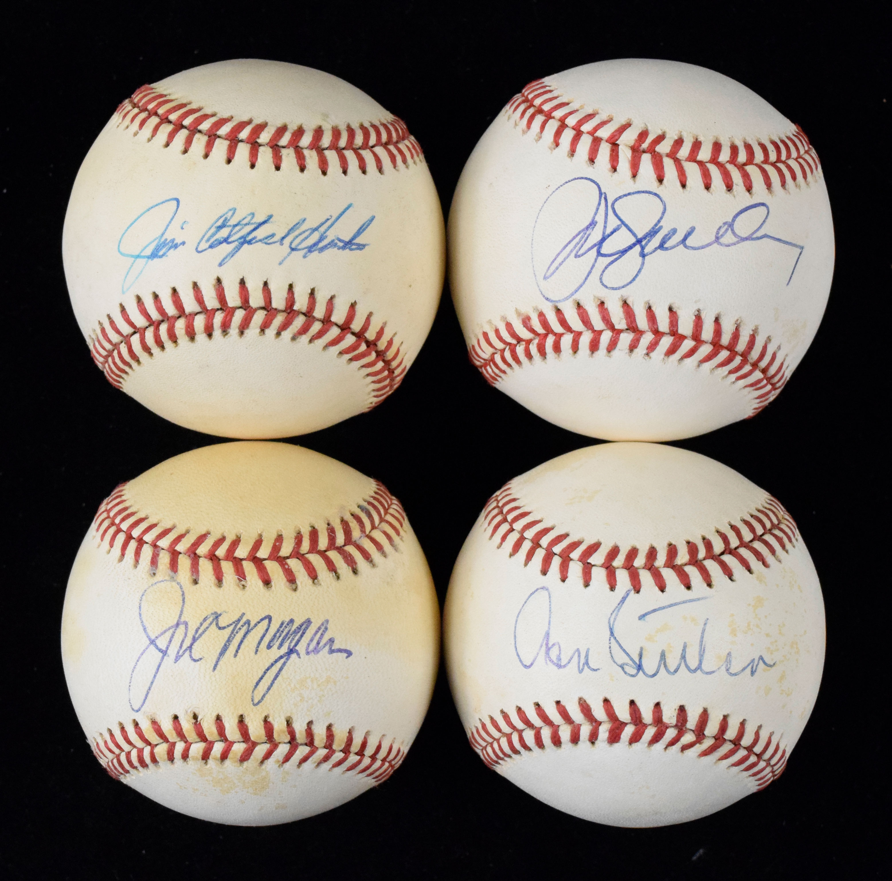 Description:Lot of (6) HOFers signed baseballs (VG-EX/MT). Includes B.Brown AL ball signed by Jim "Catfish" Hunter, W.White NL ball signed by Don Sutton, W.White NL ball signed by Joe Morgan, W.White NL ball signed by Ryne Sandberg, B.Brown AL ball signed by Jim Palmer, and W.White NL ball signed by Andre Dawson (personalized to Lou). Signatures rate 7/8 to 9/10 out of 10. Most balls appear to average VG/EX overall due to various degrees of toning (Morgan most toned). Range: VG-EX/MT