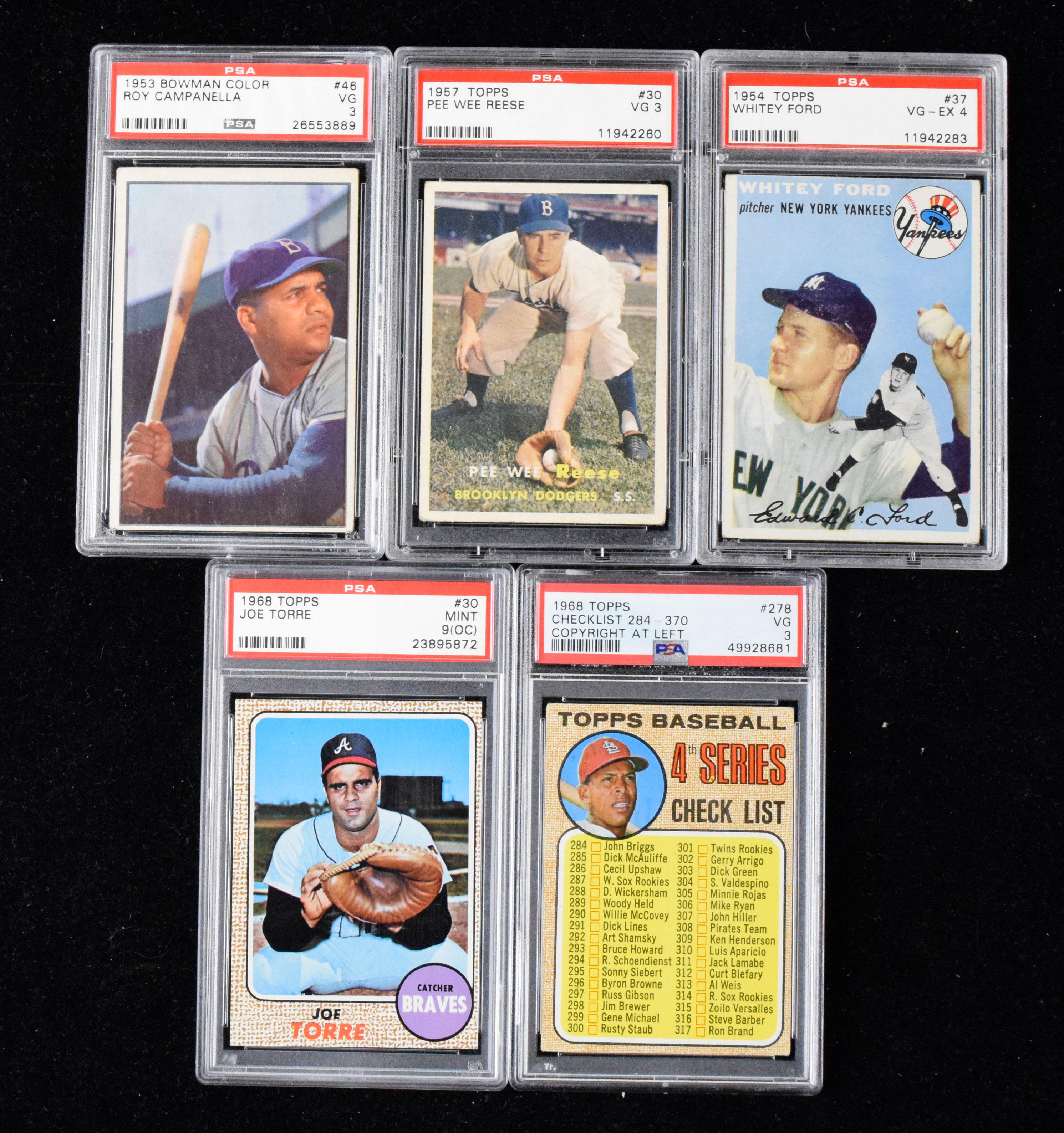 Lot of (5) HOFers graded baseball cards from 1953-1968 (VG - MT oc). Includes 1953 Bowman Color #46 Roy Campanella (PSA 3 VG), 1954 Topps #37 Whitey Ford (PSA 4 VG/EX), 1957 Topps #30 Pee Wee Reese (PSA 3 VG), 1968 Topps #s 30 Joe Torre (PSA 9 MT oc) and 278 Orlando Cepeda checklist with copyright at left (PSA 3 VG).