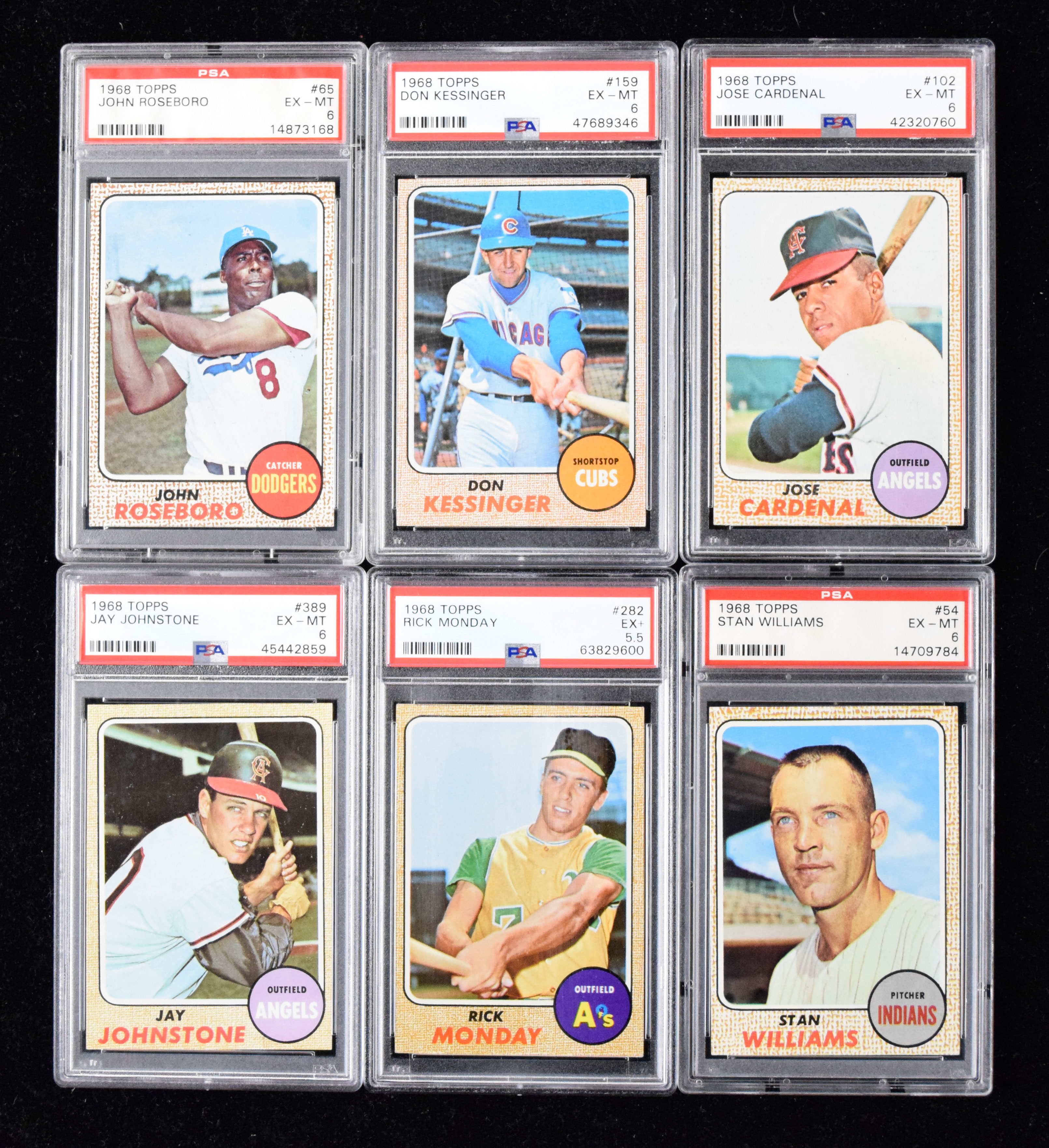 Lot of (14) graded 1968 Topps Baseball cards (EX-EX/MT). Includes #s 54 Williams (PSA 6 EX/MT), 65 Roseboro (PSA 6 EX/MT), 95 Aspromonte (PSA 6 EX/MT), 102 Cardenal (PSA 6 EX/MT), 126 Ethridge (PSA 5 EX), 159 Kessinger (PSA 6 EX/MT), 203 Kelley (PSA 6 EX/MT), 218 Suarez (PSA 6 EX/MT), 268 Humphreys (PSA 6 EX/MT), 282 Monday (PSA 5.5 EX+), 324 Nash (PSA 5 EX), 389 Johnstone (PSA 6 EX/MT), 403 Buzhardt (PSA 6 EX/MT), and 587 Repoz (PSA 6 EX/MT).