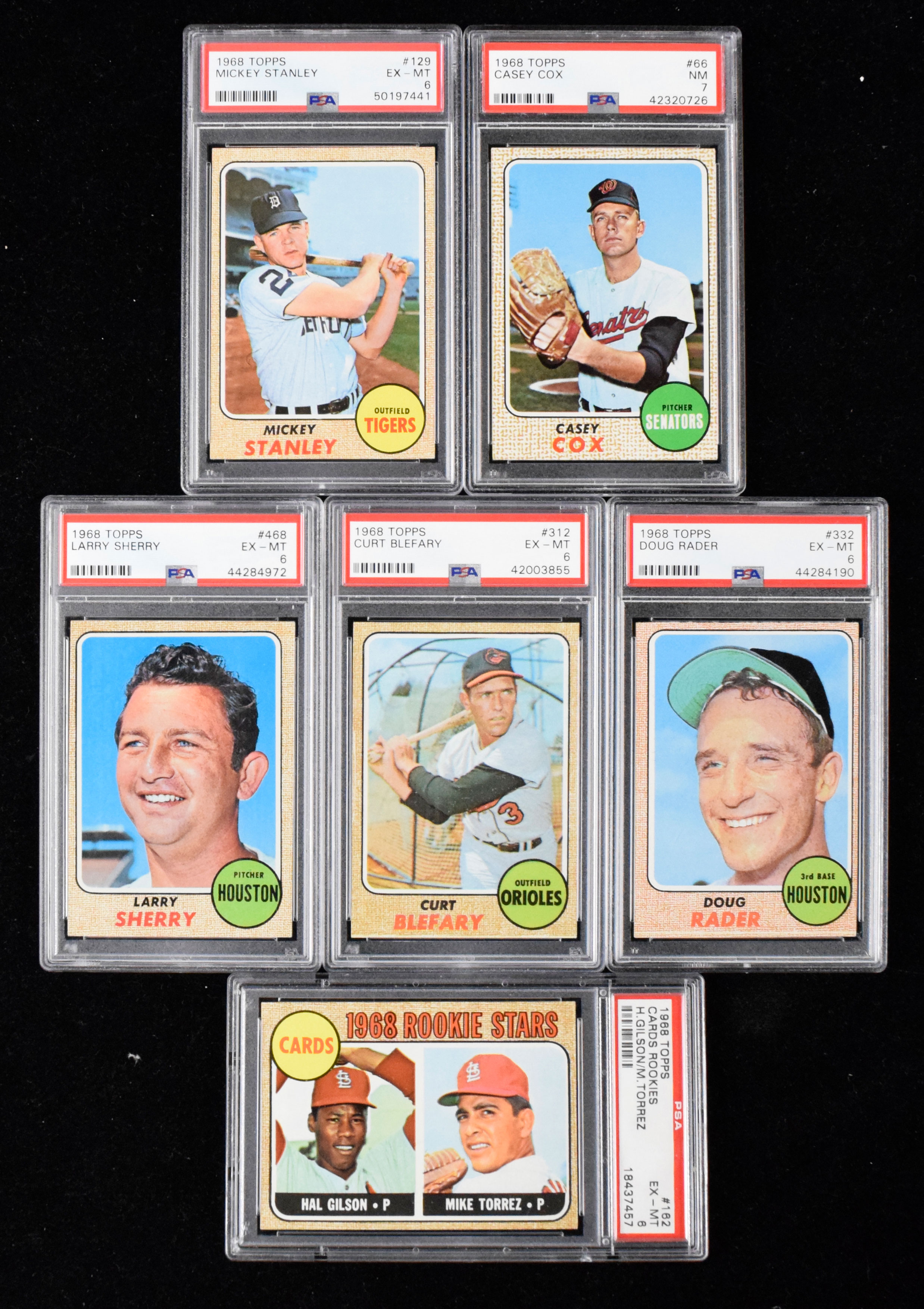 Lot of (14) graded 1968 Topps Baseball cards (EX/MT-NM). Includes #66 Cox white team graded psa 7 (NM); and (13) graded PSA 6 EX/MT: #s 125, 129, 131, 142, 162, 213, 312, 313, 314, 332, 468, 491, and 521: EX/MT-NM