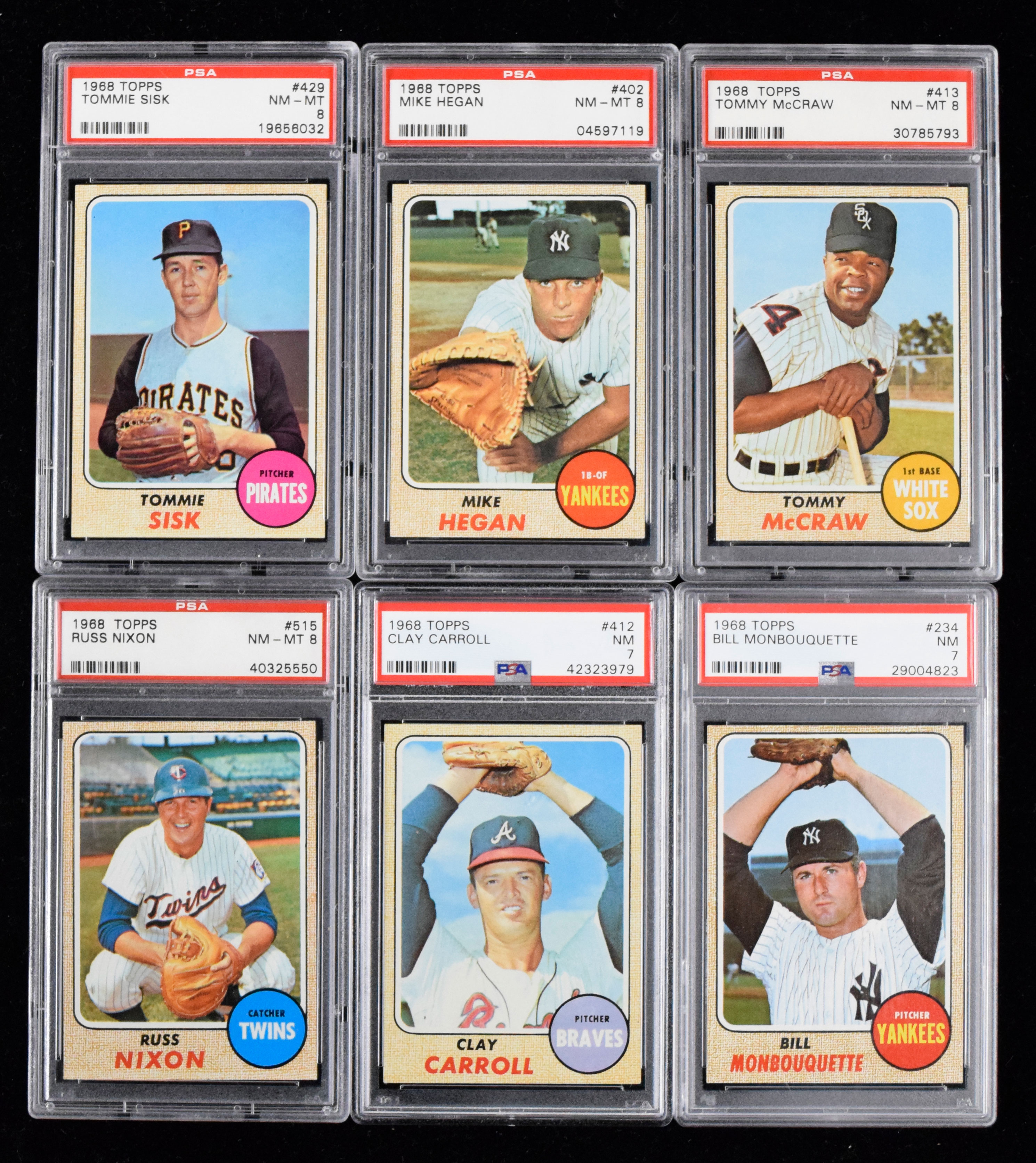 Lot of (11) graded 1968 Topps Baseball cards (EX/MT-NM/MT). Includes #s 222 Hardin (PSA 7 NM), 234 Monbouquette (PSA 7 NM), 248 Valentine (PSA 7 NM), 249 Singer (PSA 7 NM), 267 Franks (PSA 6 EX/MT), 276 Roland (PSA 7 NM), 402 Hegan (PSA 8 NM/MT), 412 Carroll (PSA 7 NM), 413 McCraw (PSA 8 NM/MT), 429 Sisk (PSA 8 NM/MT), and 515 Nixon (PSA 8 NM/MT).