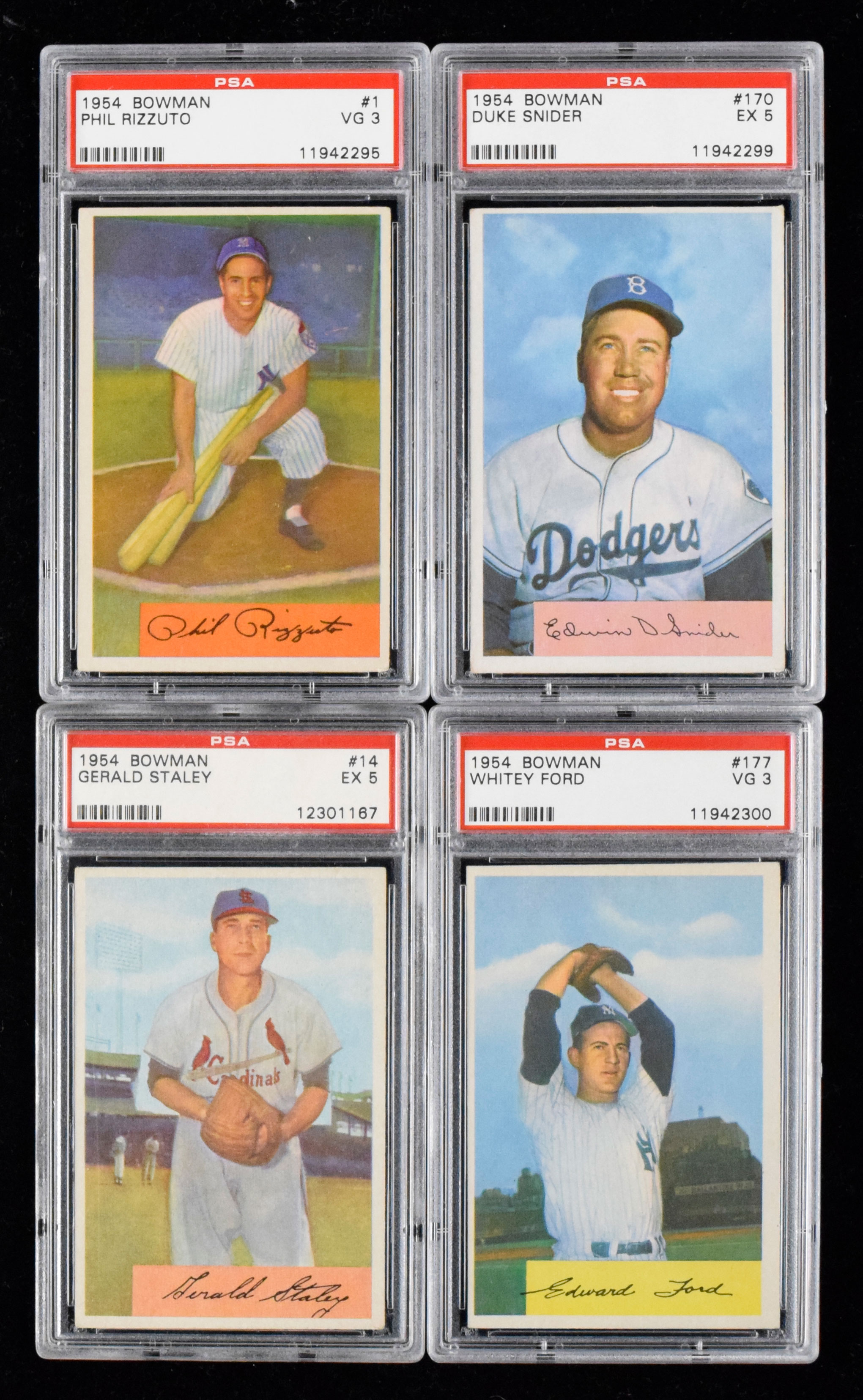 Phil Rizzuto, Duke Snider, Whitey Ford, Gerald Staley graded 1954 Bowman Baseball cards (VG-EX). Includes #s 1 Rizzuto (PSA 3 VG), 14 Staley (PSA 5 EX), 170 Snider (PSA 5 EX), and 177 Ford (PSA 3 VG).
