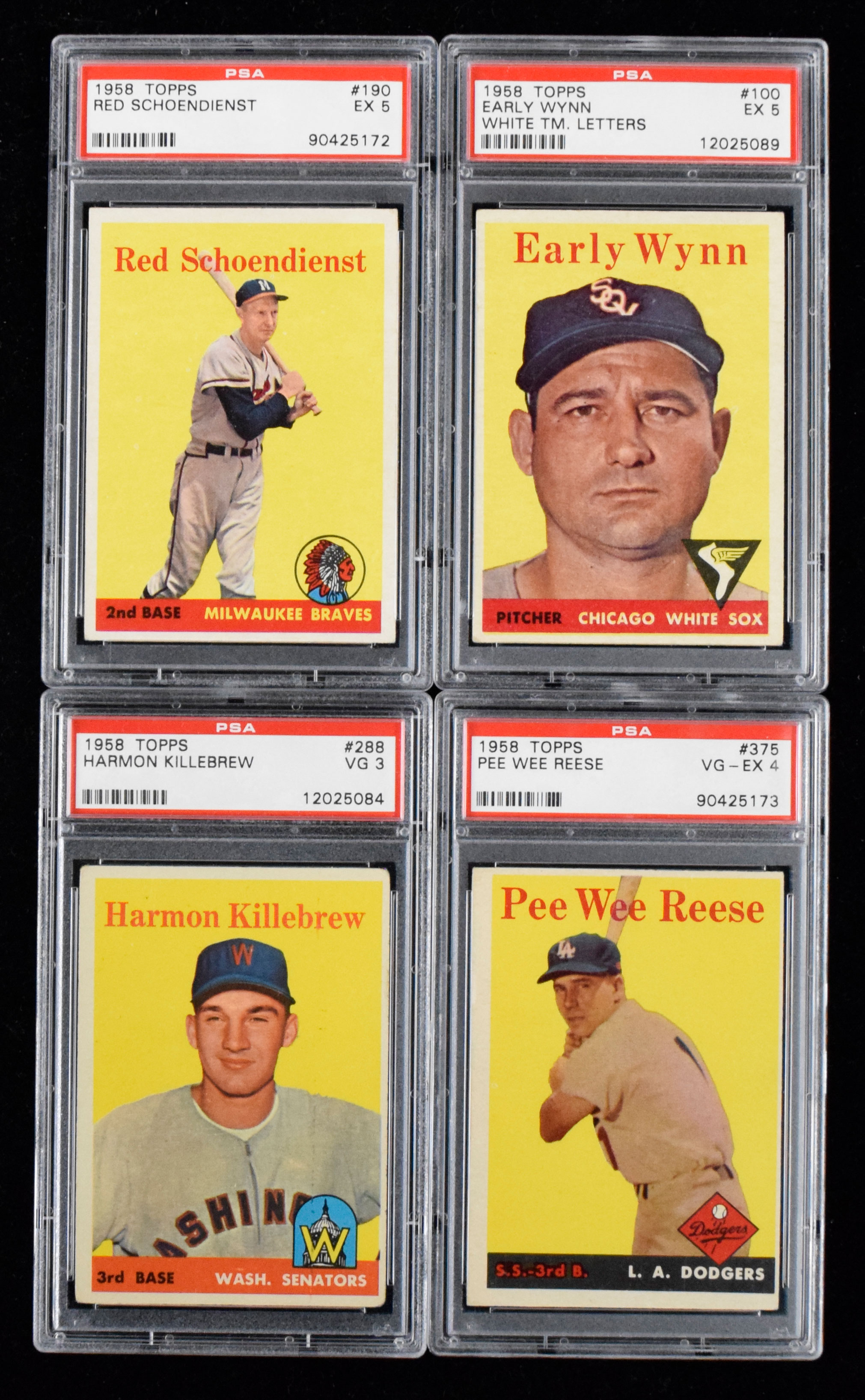 Harmon Killebrew, Pee Wee Reese, Red Schoendienst, Early Wynn graded 1958 Topps Baseball cards (VG-EX). Includes #s 100 Wynn white team (PSA 5 EX), 190 Schoendienst (PSA 5 EX), 288 Killebrew (PSA 3 VG), and 375 Reese (PSA 4 VG/EX).