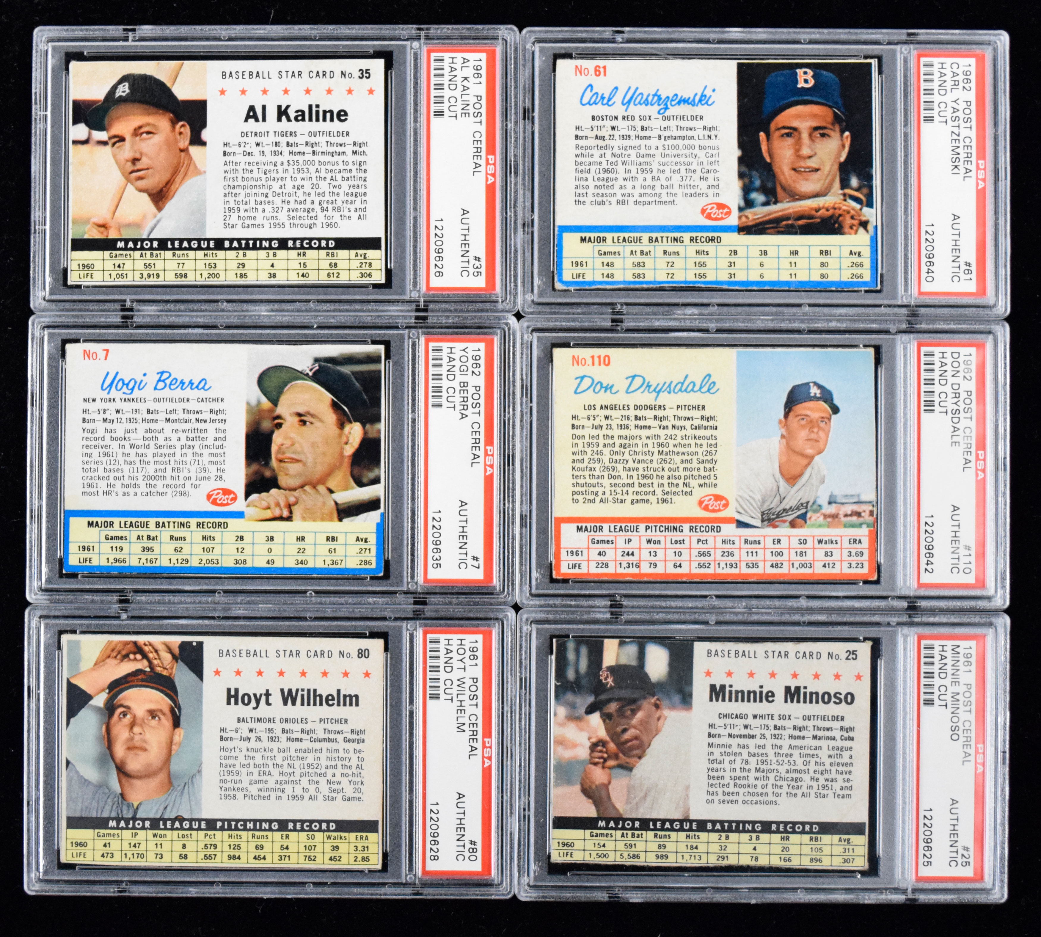 Description:Lot of (9) stars & HOFers 1961 and 1962 Post Cereal baseball cards all graded PSA Authentic (FR/GD-EX appearance). All are hand cut. Includes 1961 Post #s 8 Richardson (FR/GD back stains), 25 Minnie Minoso (VG), 35 Al Kaline (VG/EX-EX), 36 Colavito (EX), 80 Hoyt Wilhelm (VG/EX); and 1962 Post #s 7 Yogi Berra (VG/EX), 20 Kaline (VG/EX-EX), 61 Carl Yastrzemski (VG-VG/EX), 110 Don Drysdale (VG). All are encased within PSA Authentic holders: FR/GD-EX appearance
