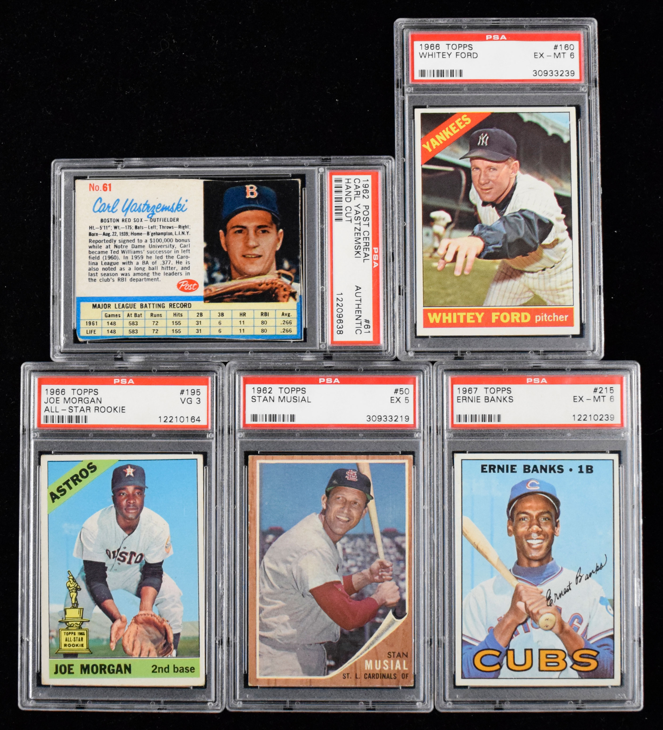 Description:Lot of (5) HOFers graded baseball cards from 1962-1967 (VG-EX/MT). Includes 1962 Topps #50 Stan Musial (PSA 5 EX), 1962 Post Cereal #61 Carl Yastrzemski hand cut (PSA Authentic VG-VG/EX appearance), 1966 Topps #s 160 Whitey Ford (PSA 6 EX/MT) and 195 Joe Morgan (PSA 3 VG), 1967 Topps #215 Ernie Banks (PSA 6 EX/MT).