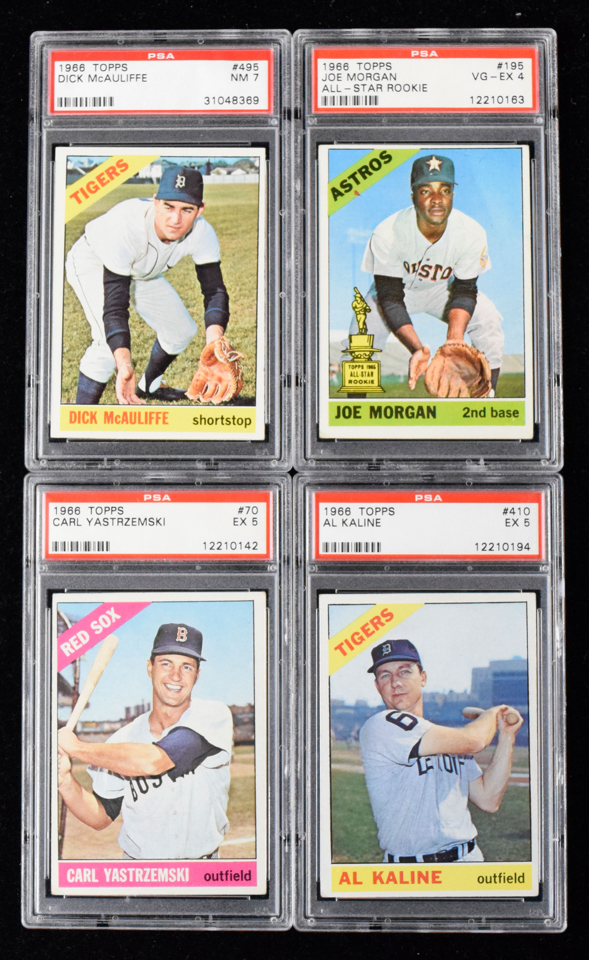 Al Kaline, Joe Morgan, Carl Yastrzemski, Dick McAuliffe graded 1966 Topps Baseball cards (VG/EX-NM). Includes #s 70 Yastrzemski (PSA 5 EX), 195 Morgan (PSA 4 VG/EX), 410 Kaline (PSA 5 EX), and 495 McAuliffe (PSA 7 NM).