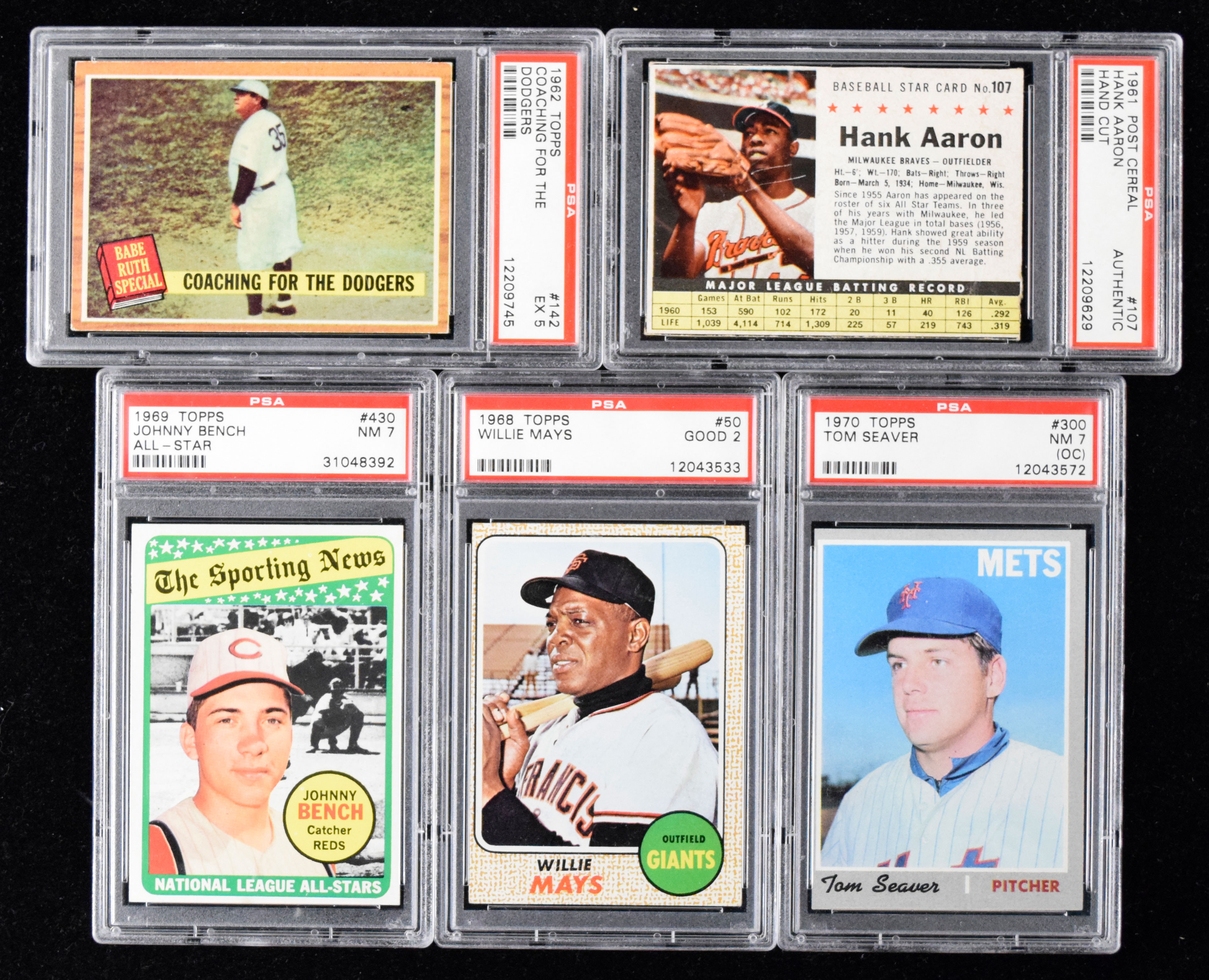 Lot of (5) HOFers graded baseball cards from 1961-1970 (GD-NM). Includes 1961 Post Cereal #107 Hank Aaron hand cut (PSA Authentic, VG appearance), 1962 Topps #142 Babe Ruth (PSA 5 EX), 1968 Topps #50 Willie Mays (PSA 2 GD), 1969 Topps #430 Johnny Bench (PSA 7 NM), and 1970 Topps #300 Tom Seaver (PSA 7 NM off-center).