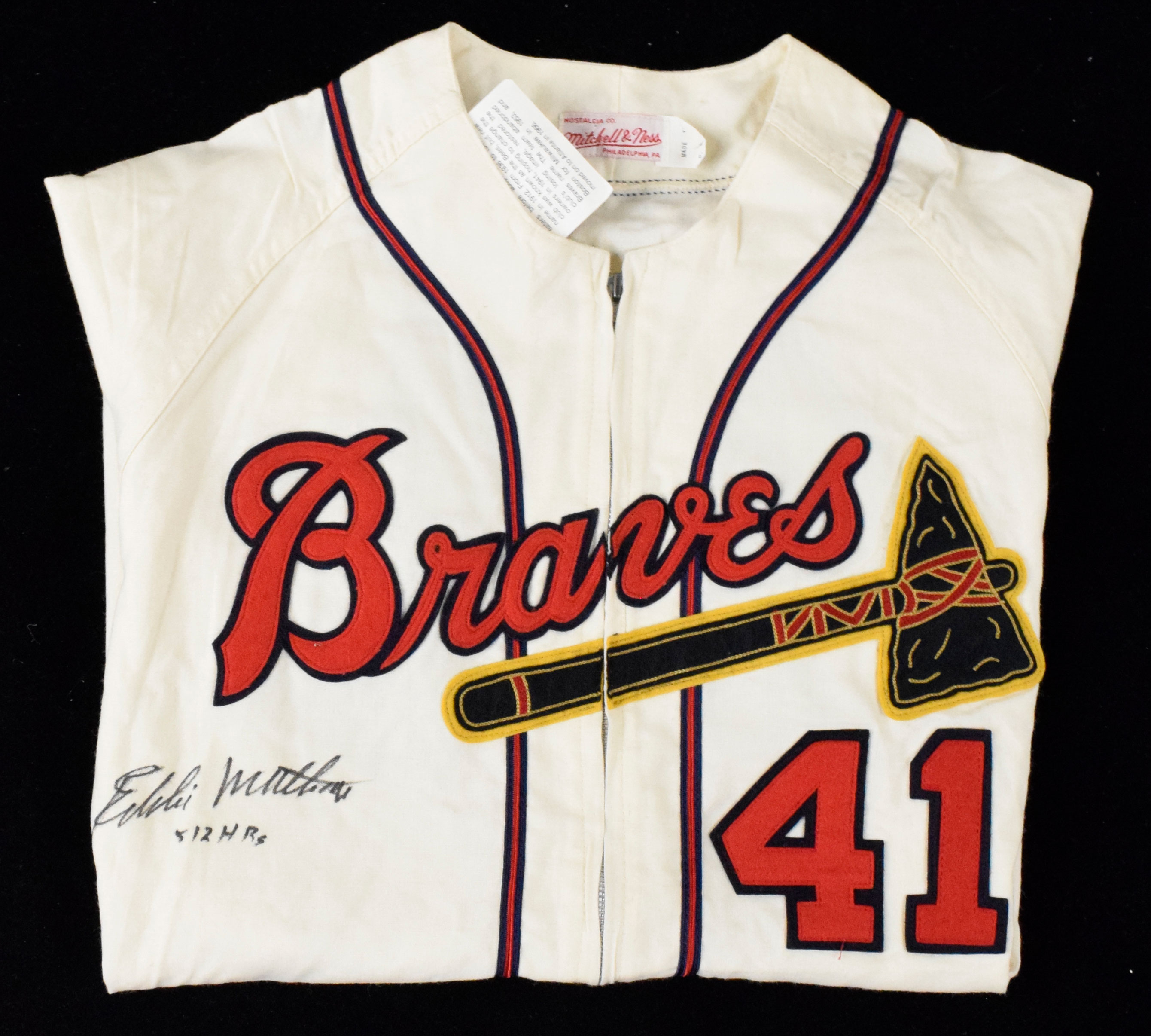 Description:Eddie Mathews signed and inscribed Milwaukee Braves throwback jersey (NM). Mitchell & Ness size XL Braves #41 Eddie Mathews jersey signed by Mathews in black marker with "512 HRs" inscription. Signature rates 8/9 out of 10: NM
