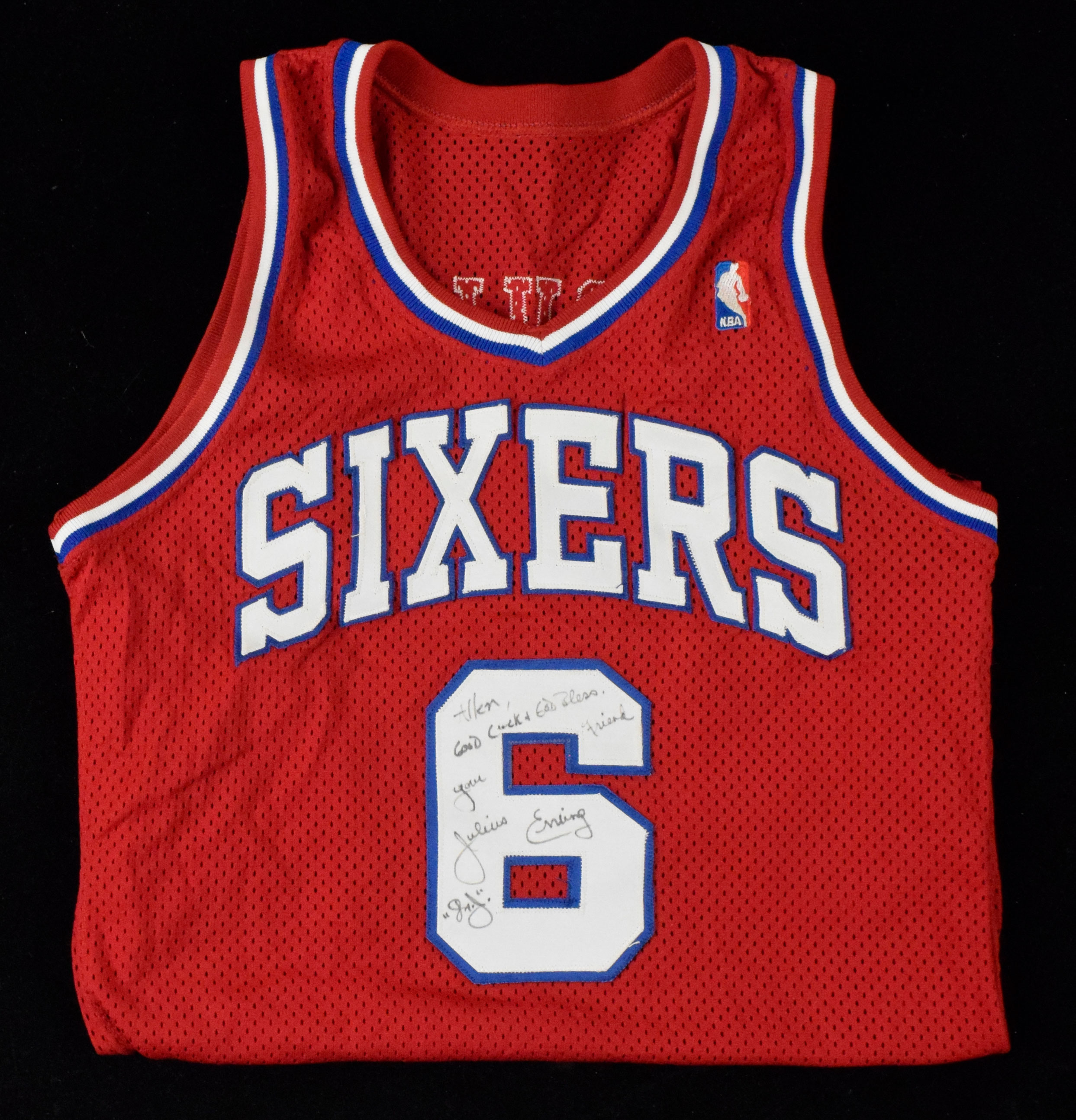 Description:Julius Erving signed & inscribed post-career Philadelphia 76ers professional quality jersey (NM). MacGregor/Sand-Knit size 40 Sixers #6 Julius Erving jersey with 1989 tagging. Erving signed the jersey in black marker and added "Dr. J" inscription (personalized). Signature rates 7/8 out of 10: NM