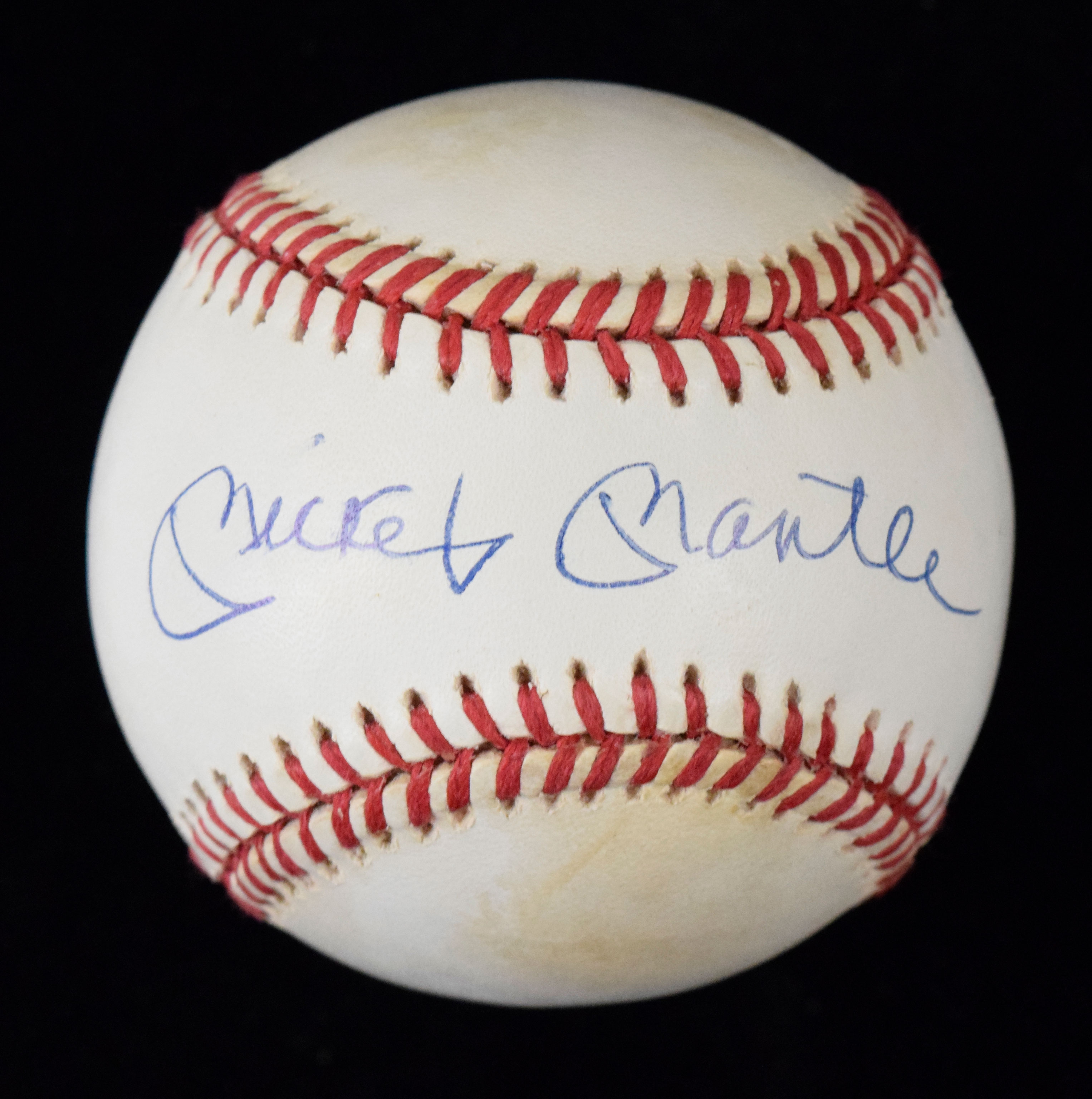 Description:Mickey Mantle signed B.Brown AL baseball - JSA (EX). Mantle signed the sweet spot in blue ink. Signature rates 8 out of 10. Includes LOA from JSA, with matching serial #ed sticker on the ball. Light to moderate toning on each panel: EX