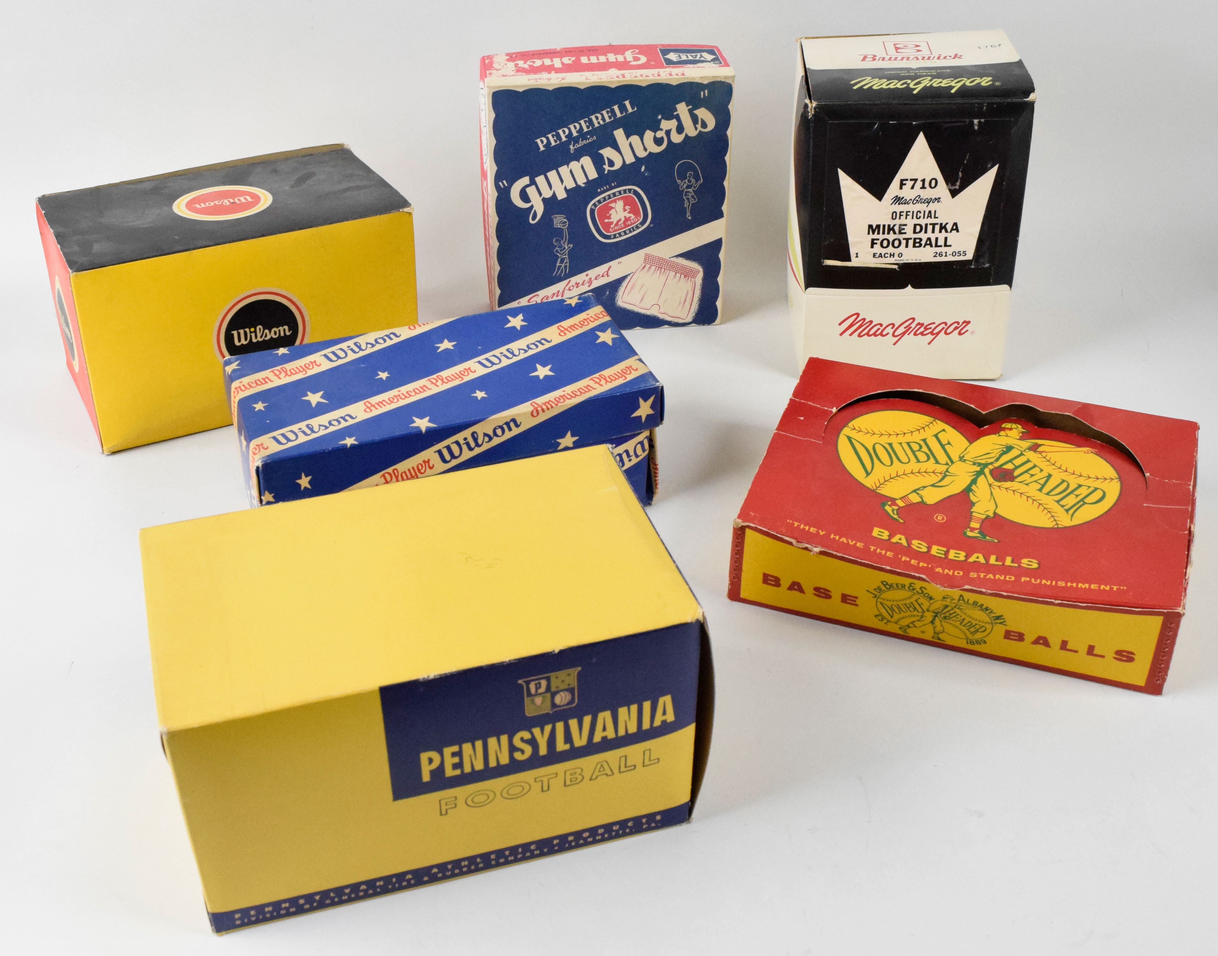 Description:Lot of (7) vintage equipment display boxes (VG-NM). Includes c.1930s-40s Yale Underwear Co. gym shorts box, c.1950s Wilson football box, c.1950s Pennsylvania Athletic Products football box, (2) c.1950s-60s Wilson shoe boxes, c.1960s J.deBeer box for (12) Pony League baseballs, and c.1960s-70s MacGregor-Brunswick box for Mike Ditka endorsed football. Most appear to average VG/EX-EX overall. Range: VG-NM