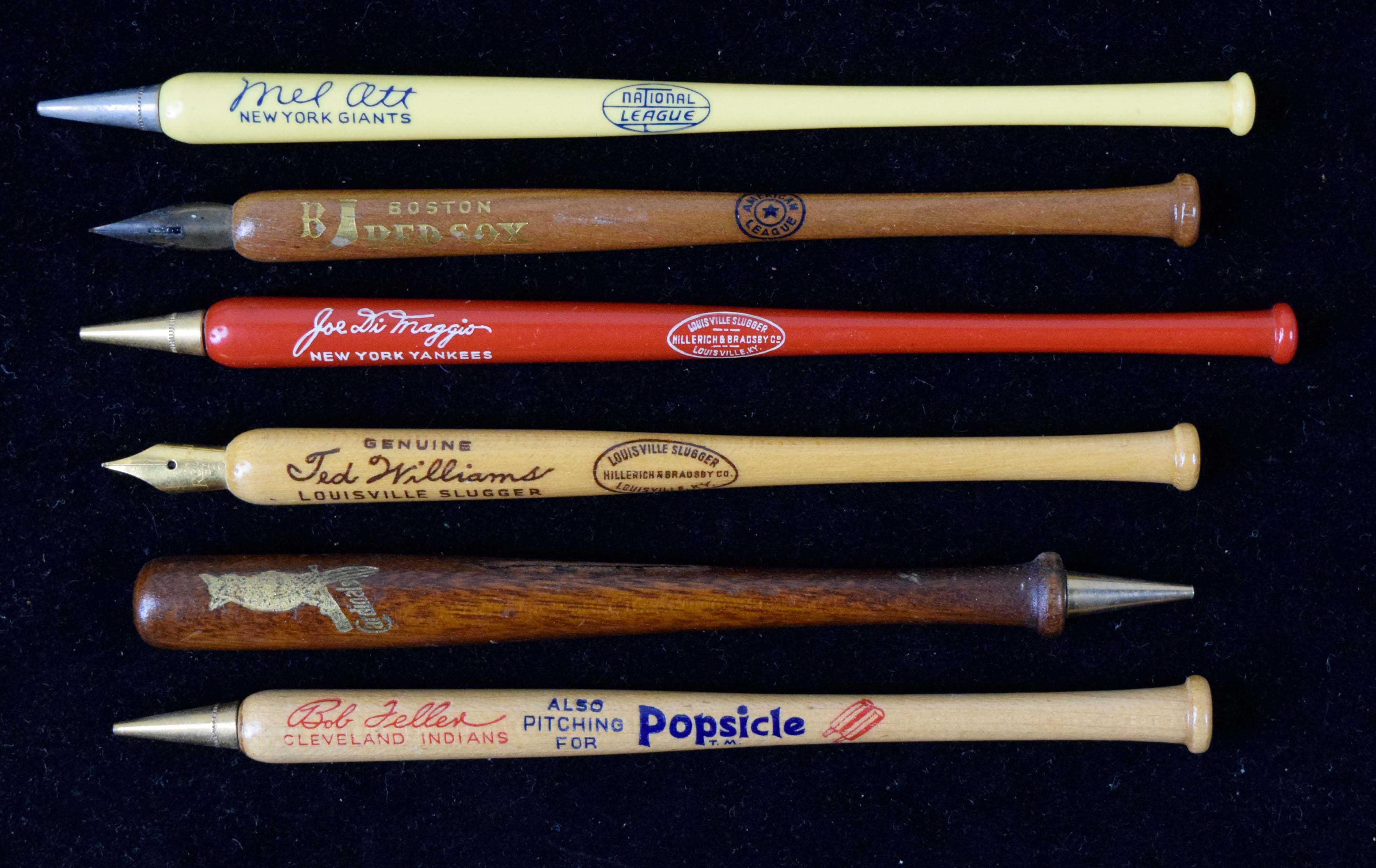 Description:Lot of (6) vintage baseball bat pens and pencils, c.1940s (EX/MT-NM/MT). Includes a Ted Williams pen, Bob Feller pencil, Mel Ott pencil, Joe DiMaggio pencil, St. Louis Cardinals pencil, and Boston Red Sox pen: EX/MT-NM/MT