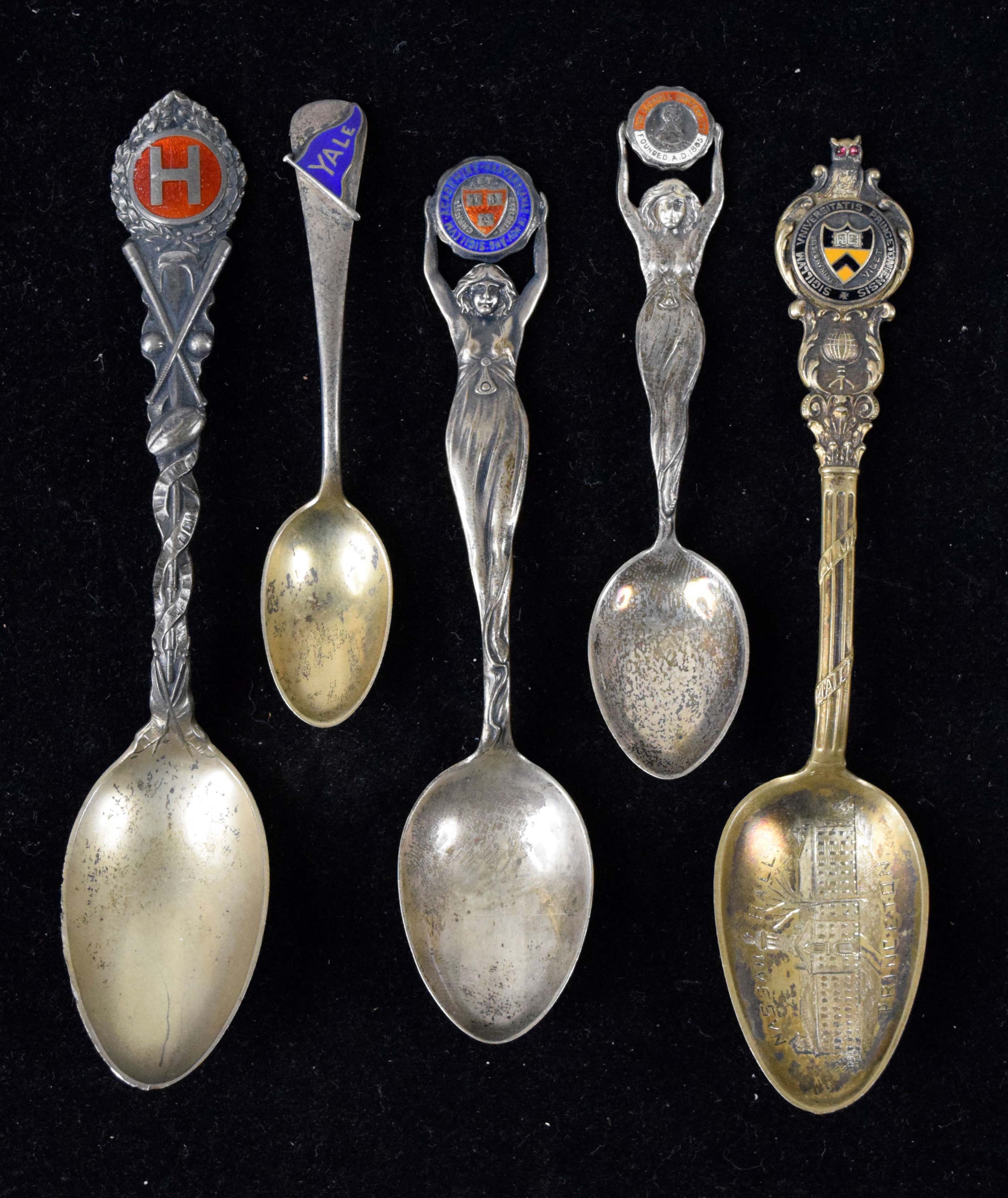 Lot of (5) vintage decorative Ivy League spoons, c.1890s-1900s (EX-EX/MT). Includes 5.75" Harvard baseball spoon marked Sterling, 5.75" Princeton spoon with etching of Nassau Hall, 5.25" Harvard spoon marked Sterling, 4" Cornell spoon marked Sterling, and 3.75" Yale spoon dated 8-26-1895 and marked Sterling: EX-EX/MT