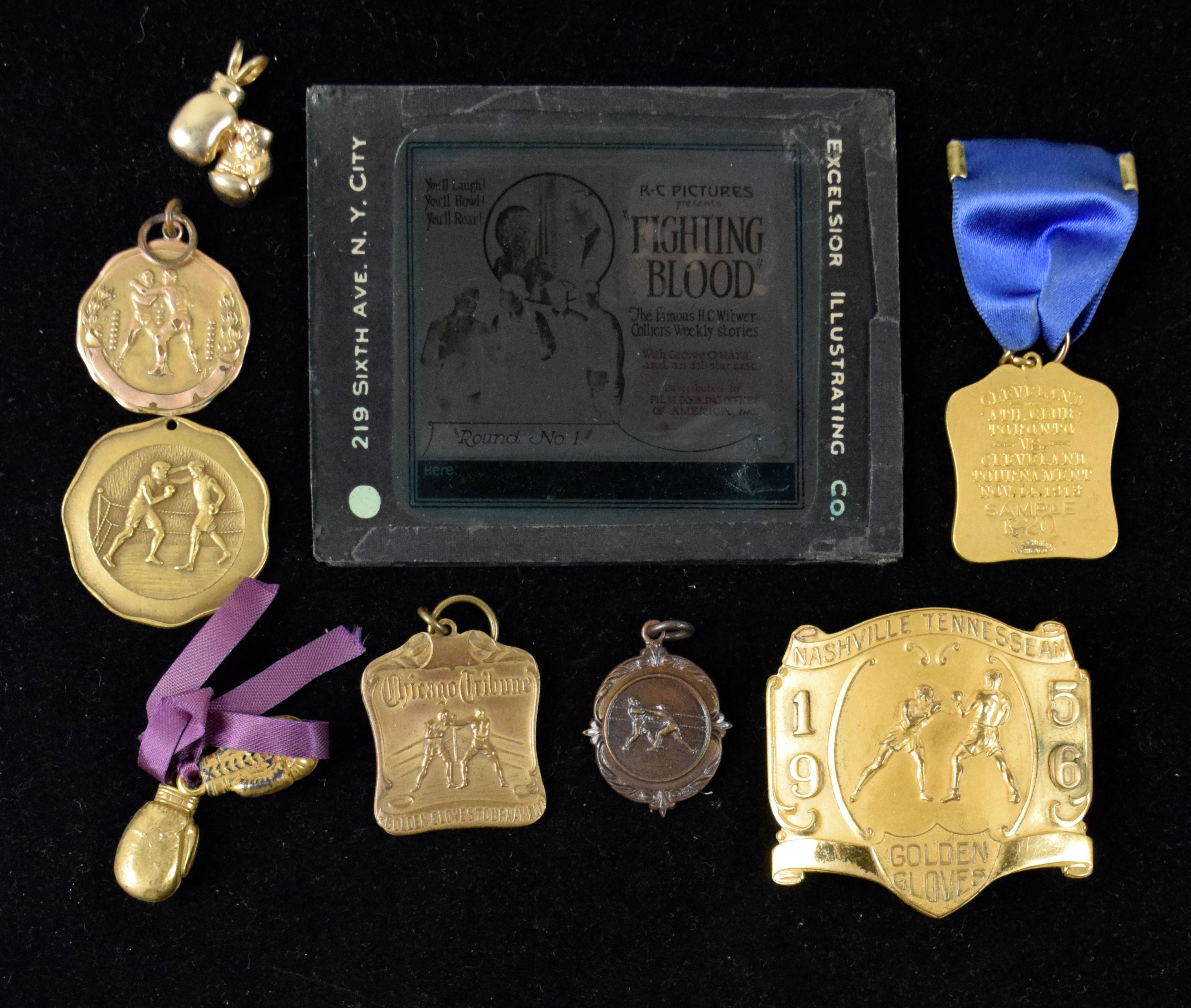 Lot of vintage boxing memorabilia, charms, pendants, etc. c.early 1900s - 1950s (EX-NM). Includes 1913 Cleveland boxing tournament sample medal, Chicago Tribune "Golden Gloves Tournament" pendant, (2) other pendants (one marked "Gold Filled"), (3) boxing charms, 1923 "Fighting Blood" glass plate negative, and 1956 Golden Gloves belt buckle: EX-NM