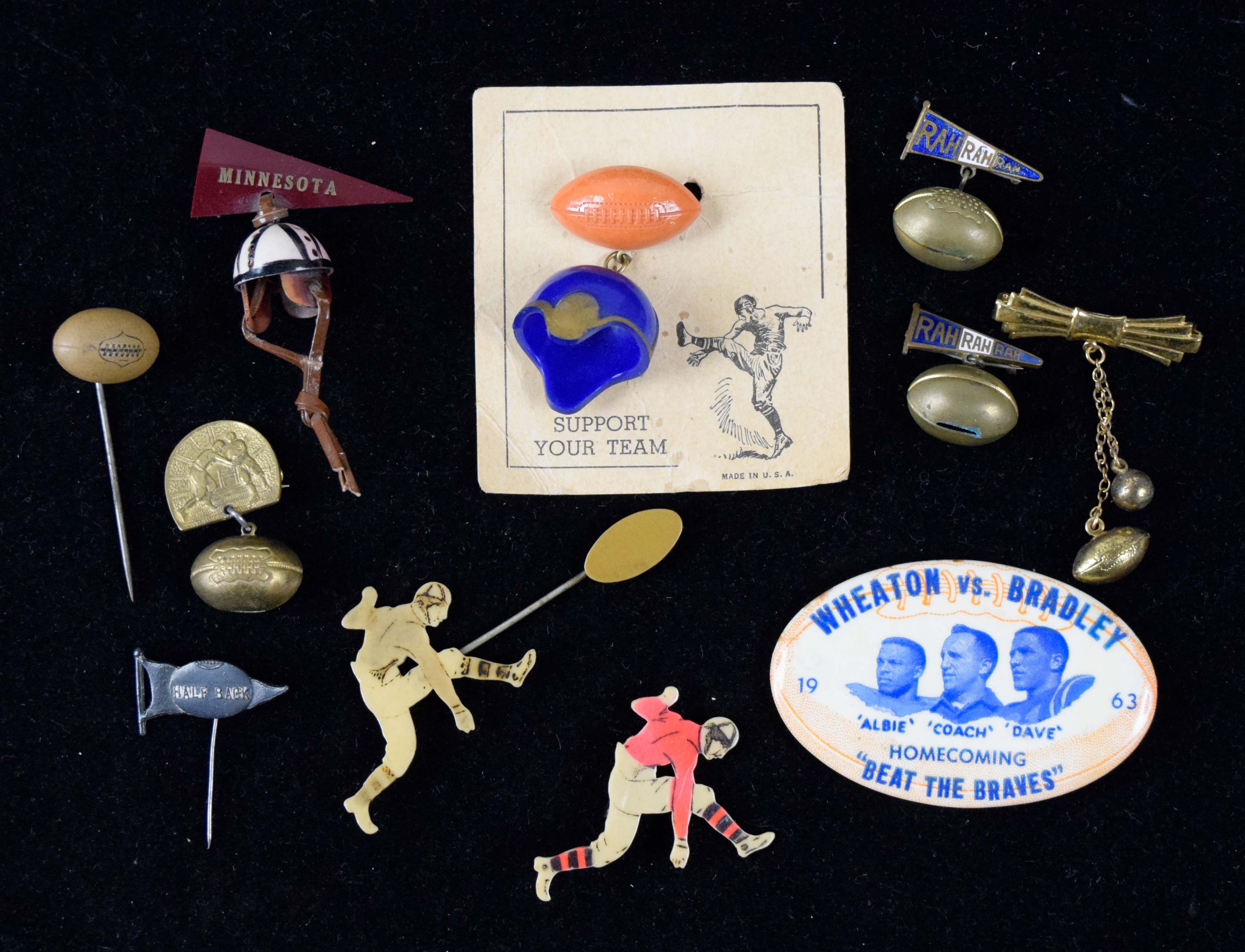 Description:Lot of (11) vintage football pins, c.early 1900s - 1963 (VG-NM). Includes (2) Rah Rah Rah pins, Minnesota pin, 1963 Wheaton vs. Bradley homecoming pin, and (7) vintage misc. football pins. Most appear to average EX-EX/MT overall. Range: VG-NM