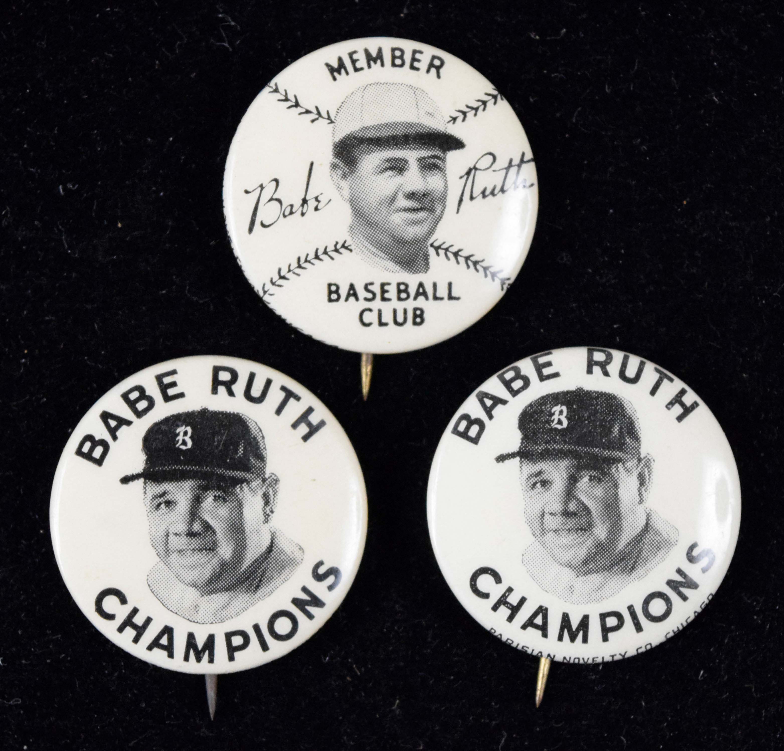 Description:1934 Babe Ruth Baseball Club pin and (2) 1935 Babe Ruth Champions pins (ERX-EX/MT). Each pin measures 1". Fronts appear NM overall, but backs have some minor tarnishing: EX-EX/MT