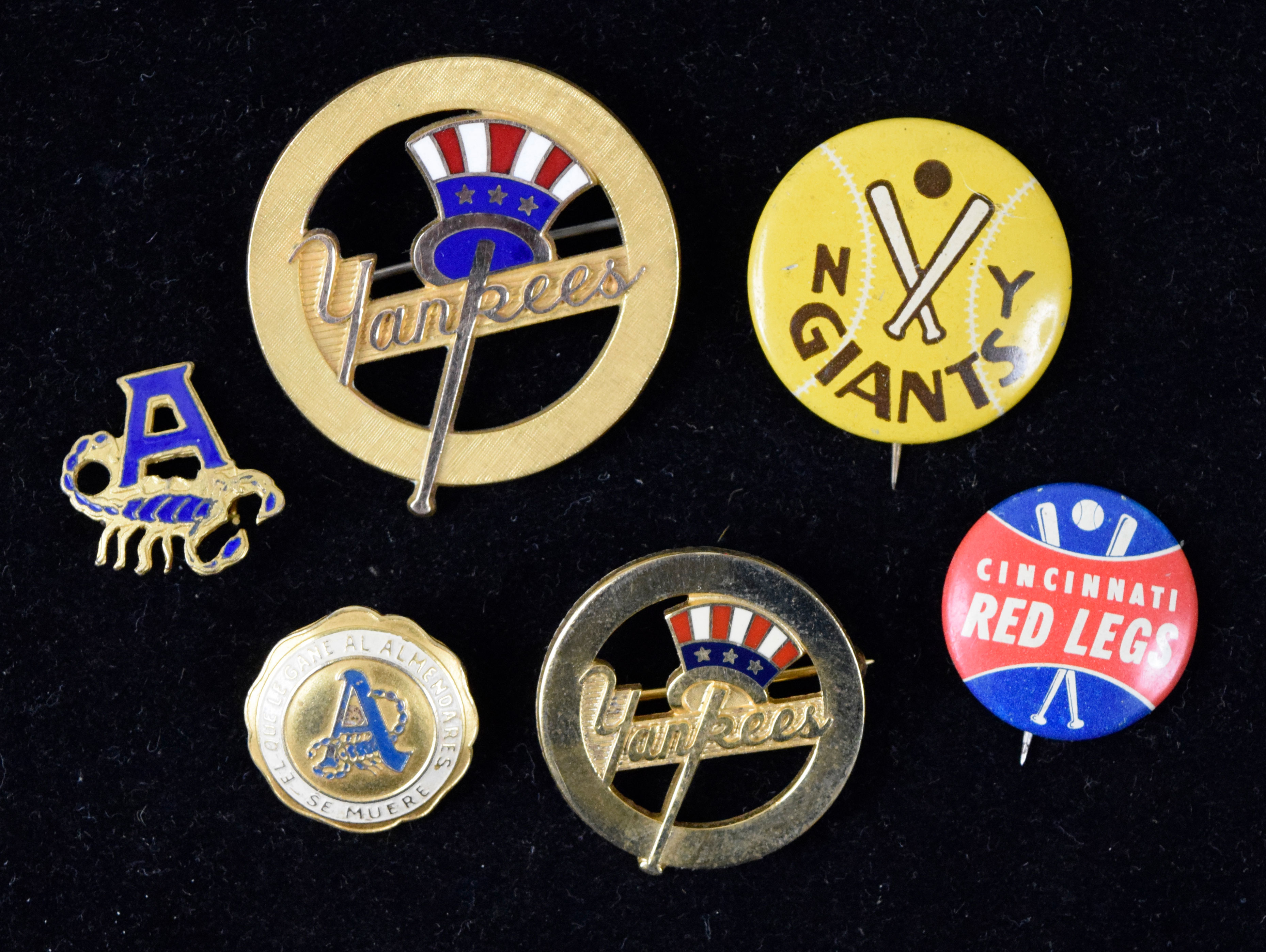Description:Lot of (8) vintage baseball pins, c.1940s-70s (EX-NM/MT). Includes c.1940s St. Louis Browns wooden pin, c.1940s New York Giants pin, (2) different c.1950s-60s Almendares Scorpions pins, c.1960s Cincinnati Red Legs pin by Crane Potato Chips, c.1960s-70s Cincinnati Reds pin, and (2) different c.1970s New York Yankees pins (one by Balfour marked "1/5 10K"): EX-NM/MT