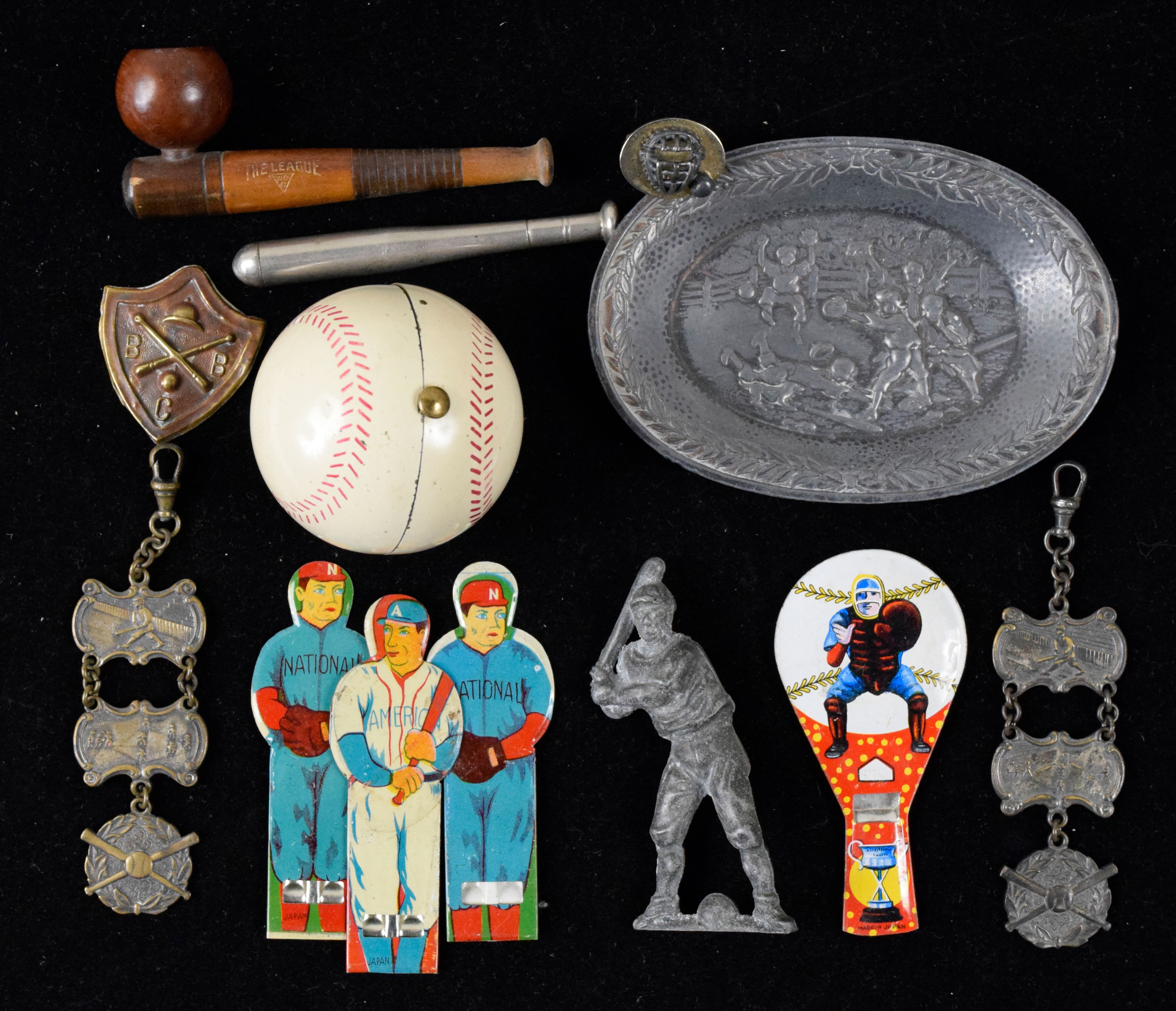 Description:Lot of vintage baseball memorabilia and trinkets, c.early 1900s - 1968 (VG-NM). Includes 3"x4.25" metal ashtray, small metal "Champions" baseball fob by Draper-Maynard, (2) 3-piece hanging baseball themed charms, 1.25"x1.5" metal "B B C" shield (appears to have been removed from something), 3.5" long baseball bat pipe, 3.25" baseball bat pencil, 3" tall lead batter, (4) 3" metal baseball game pieces, baseball compact with mirror inside, catcher's mask cufflink, and 1968 All Star Game cufflink by Balfour with "Commissioner Of Baseball" on the back. Most items appear to average EX-EX/MT overall. Range: VG-NM