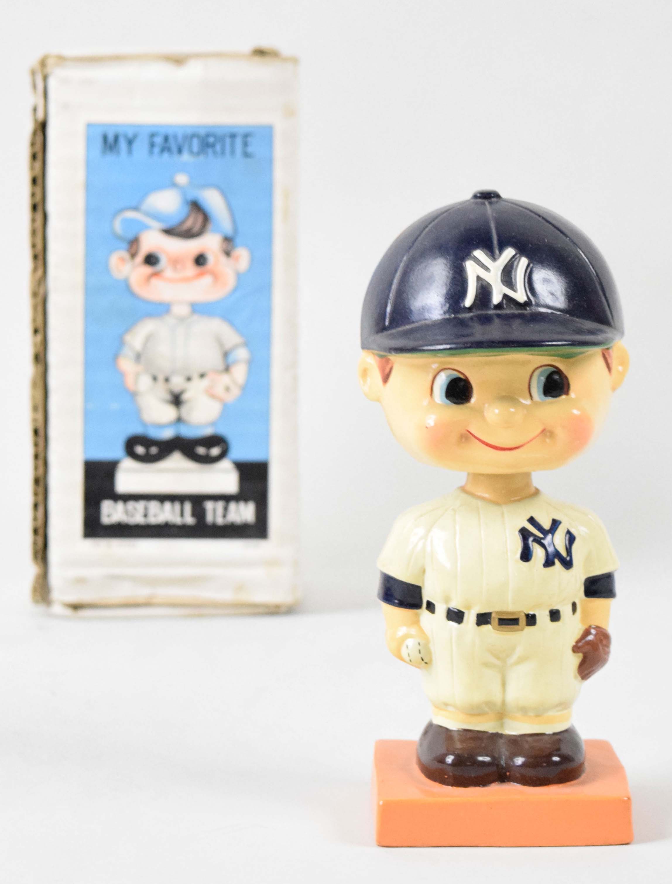 Description:New York Yankees vintage nodder, c.1960-61 (NM). Square orange base Yankees nodder shows minimal handling/storage wear. Includes its original My Favorite Baseball Team box. Nodder: NM overall