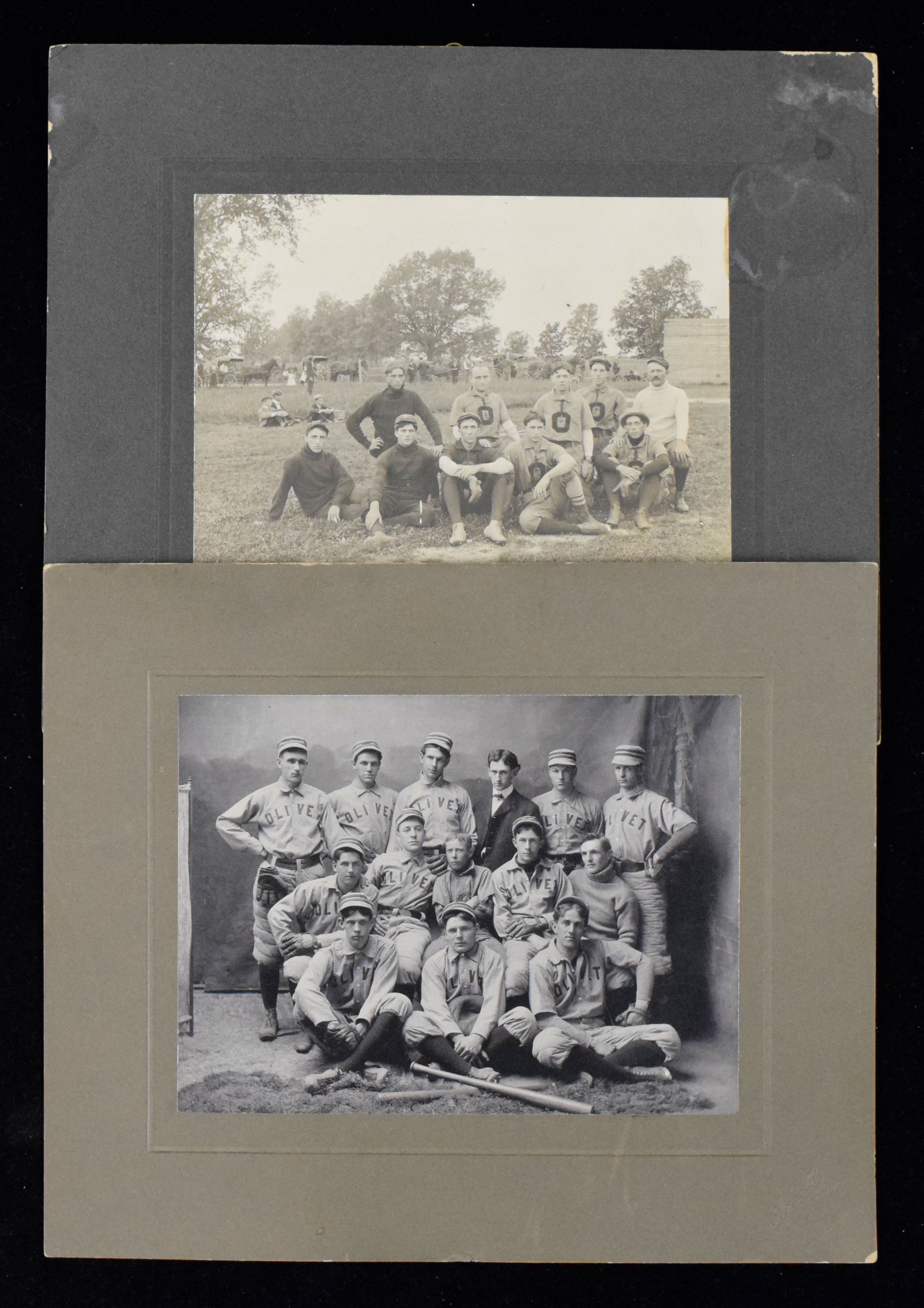 Description:Lot of (2) Olivet College baseball team photographs, c.1890s-1900s (EX-EX/MT). Includes 6"x8" team photo mounted on 10"x12" backing (EX/MT), and 5.75"x7.75" team photo mounted on 10"x12" backing identified as the 1900 team (EX stain at top right corner of the backing).