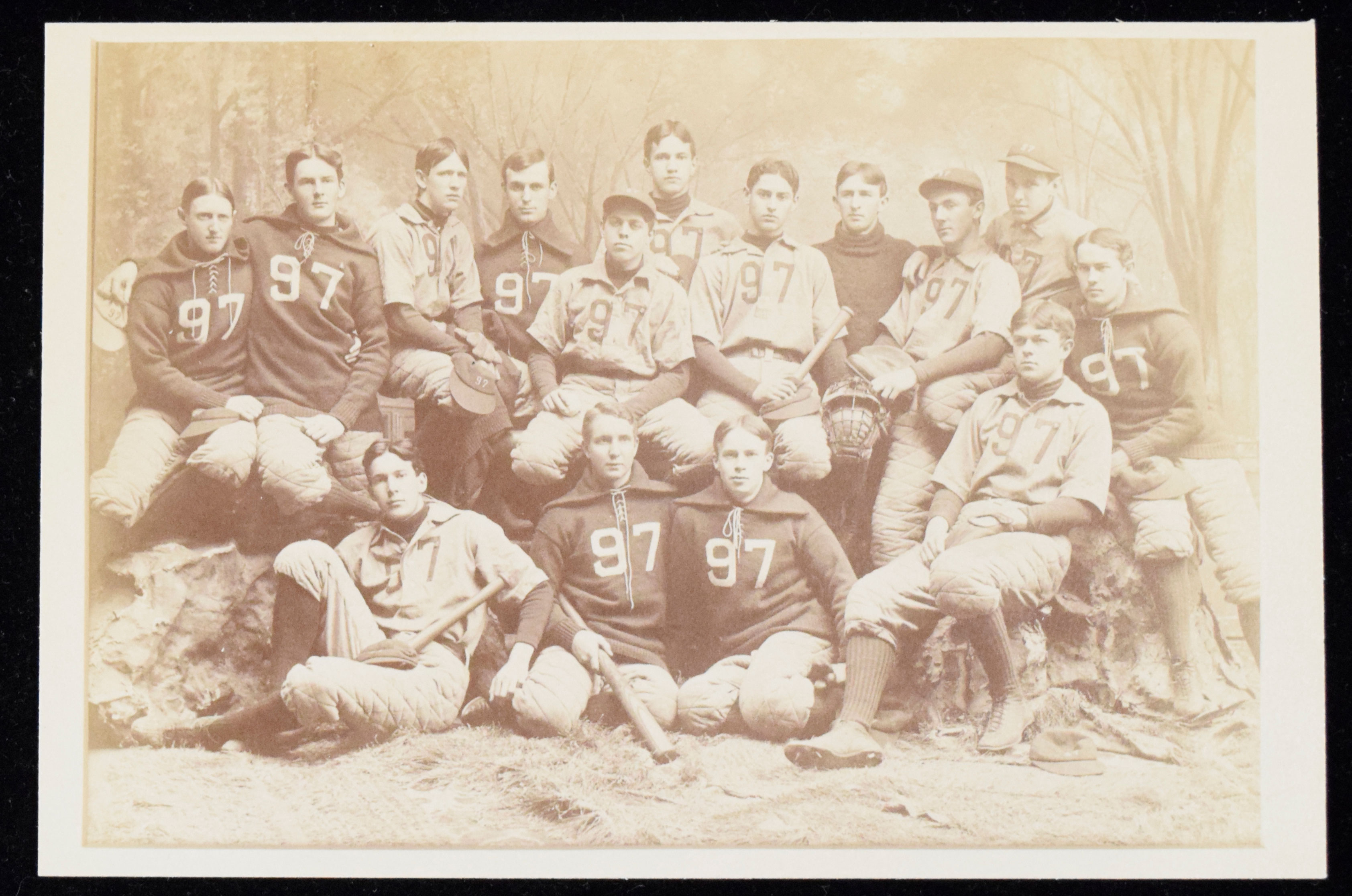 Description:Class of 1897 college baseball team photograph (NM). Approx. 5"x7.5" photo picturing a college baseball team wearing "97" jerseys and sweaters. Affixed to cardboard backing, and likely removed from a vintage college photographic yearbook: NM overall