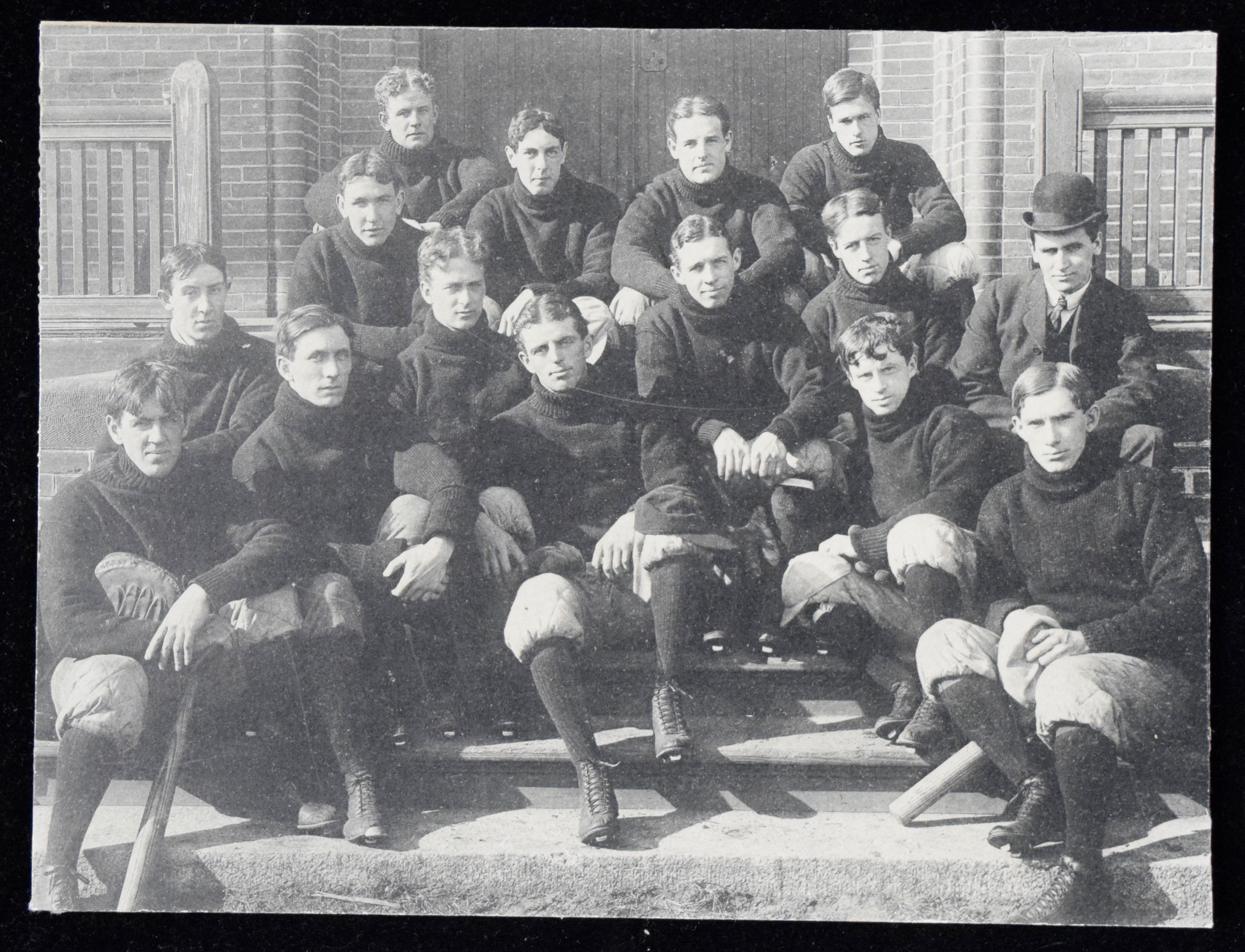 Description:Vintage college baseball team photograph, c.1890s (EX/MT). 6.5"x8.5" team photo with one of the players wearing what appears to be a "96" sweater. Affixed to cardboard backing which has surface loss likely due to removal from a vintage college photographic yearbook: EX/MT