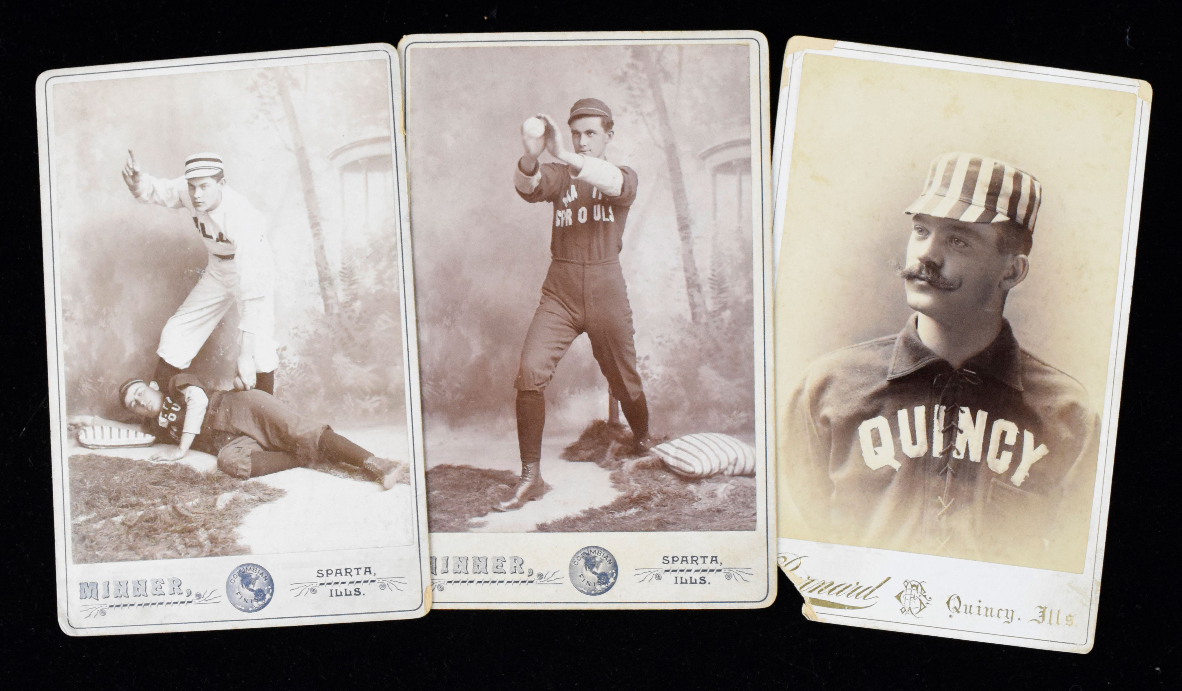 Description:Lot of (3) vintage baseball cabinet cards, c.1880s-90s (PR-VG/EX). Includes one picturing a Quincy (IL) minor league player by photographer F.C. Bernard (PR), and (2) by Minner Studios of Sparta (IL) with one picturing an individual player (VG/EX) and the other picturing a fielder tagging a sliding player (VG).