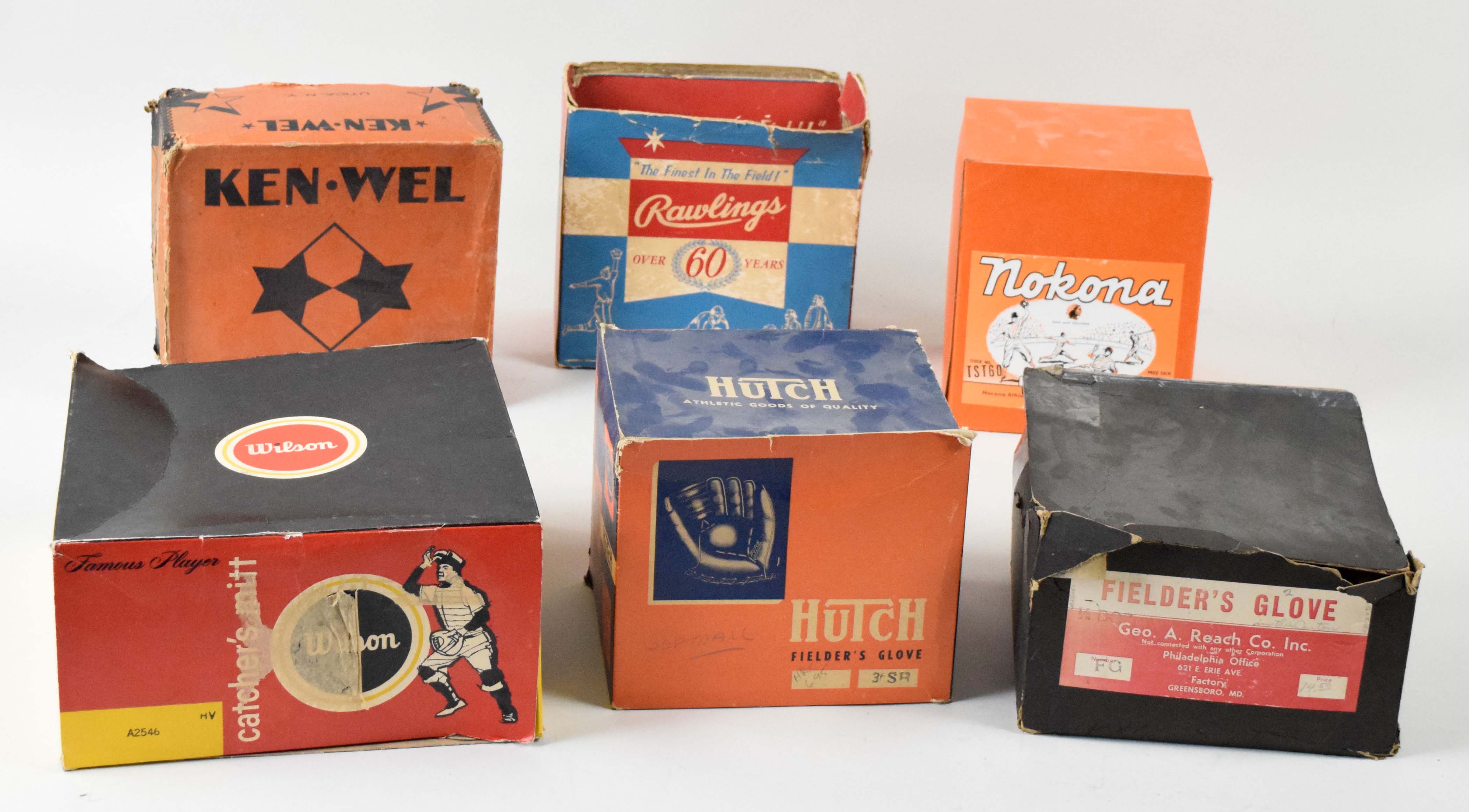 Description:Lot of (15) vintage baseball glove boxes, c.1930s-60s (PR/FR-EX/MT). Includes (4) Wilson, Rawlings, Reach, Hutch, Dubow, Ken-Wel, (3) Nokona, O.K. Mfg. Co., and (2) George Reach Co. All are empty, with various degrees of handling and storage wear. Most appear to average GD-G/VG overall. Range: PR/FR-EX/MT