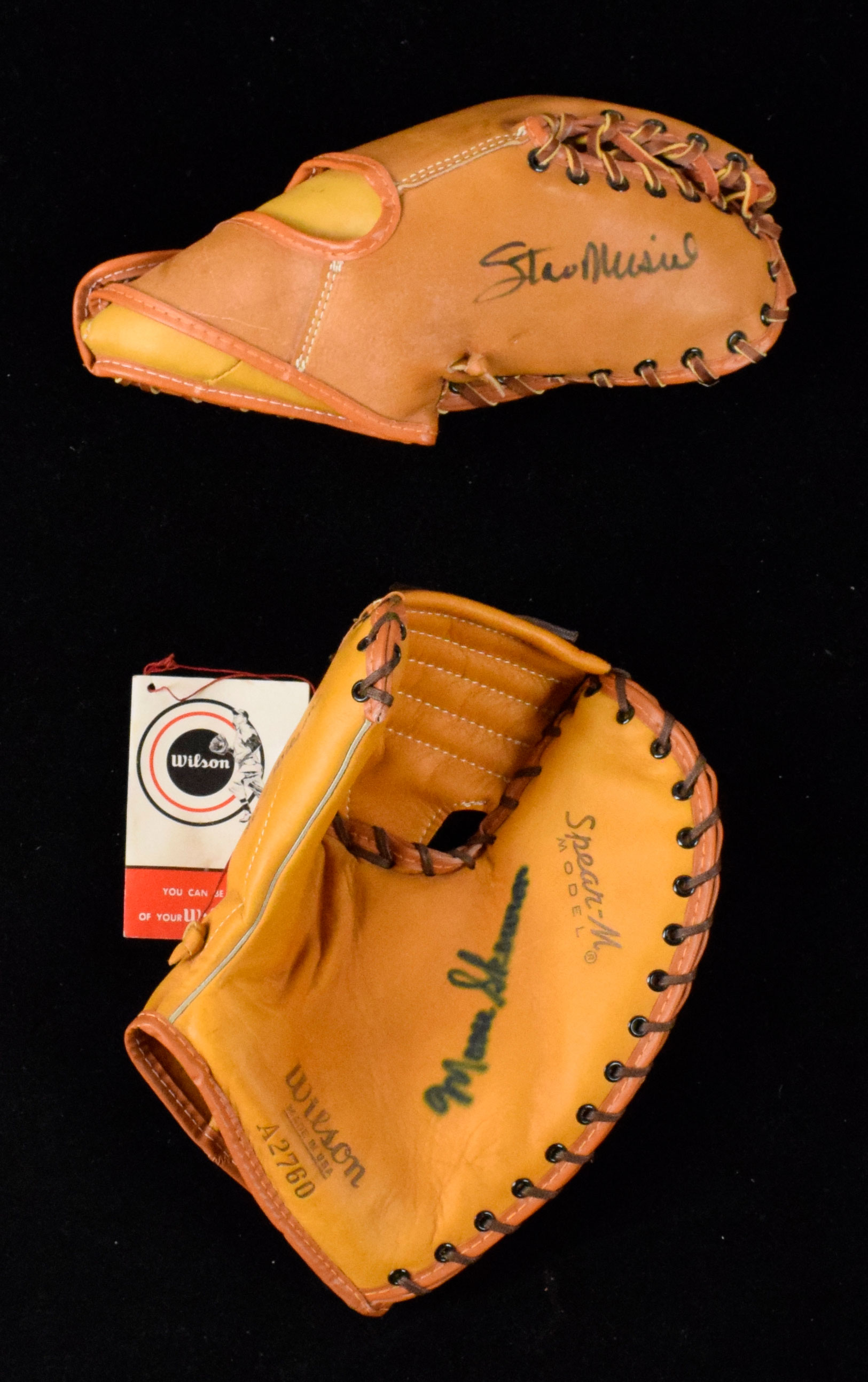 Description:Stan Musial & Moose Skowron signed vintage store model 1st base mitts (NM-NM/MT). Includes c.1950s Wilson A2690 Stan Musial model 1st base mitt signed by Musial in black marker rating 8/9 out of 10, and c.1958-59 Wilson A2760 Spear-M model 1st base mitt signed by Moose Skowron in blue marker rating 7/8 out of 10 (hang tag still attached): NM-NM/MT