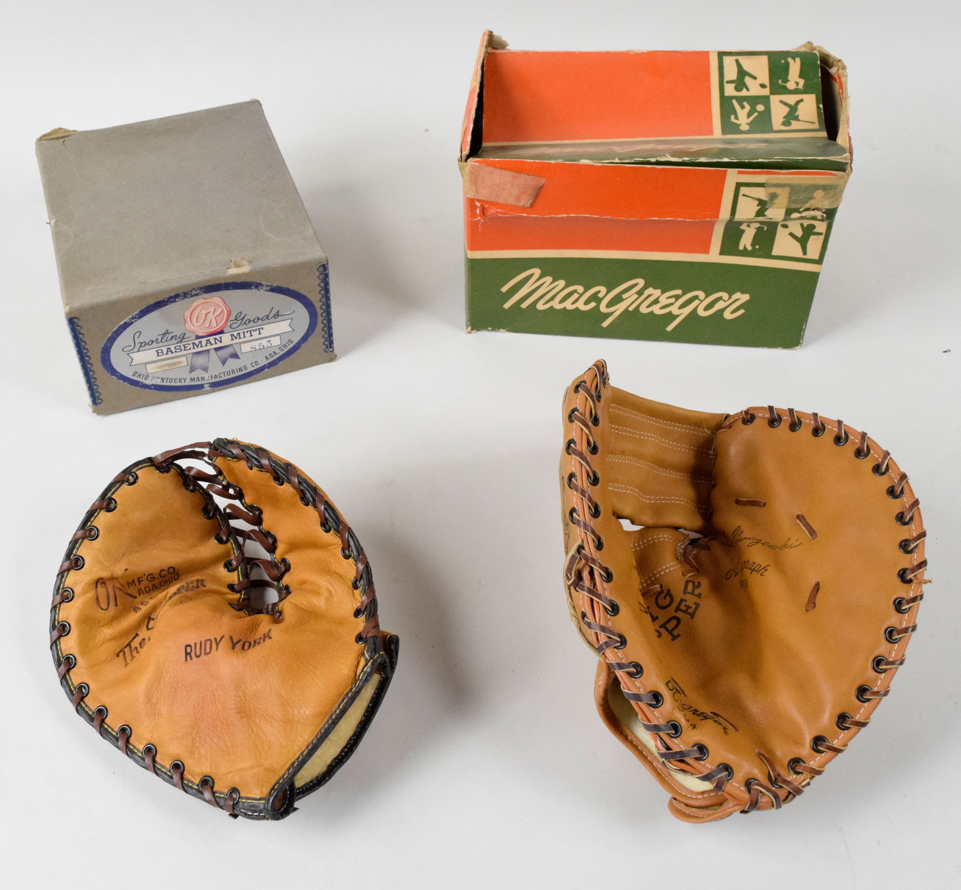 Description:Ted Kluszewski & Rudy York vintage store model 1st base mitts with original boxes c.1930s-60s (mitts NM-NM/MT, boxes GD-VG). Includes c.1930s-40s O.K. Mfg. Co. 855 Rudy York model 1st base mitt for left handed thrower (NM unused) with original box (VG), and c.late 1960s MacGregor DG954 Ted Kluszewski model 1st base mitt for right handed thrower (NM-NM/MT unused) with original box (GD).