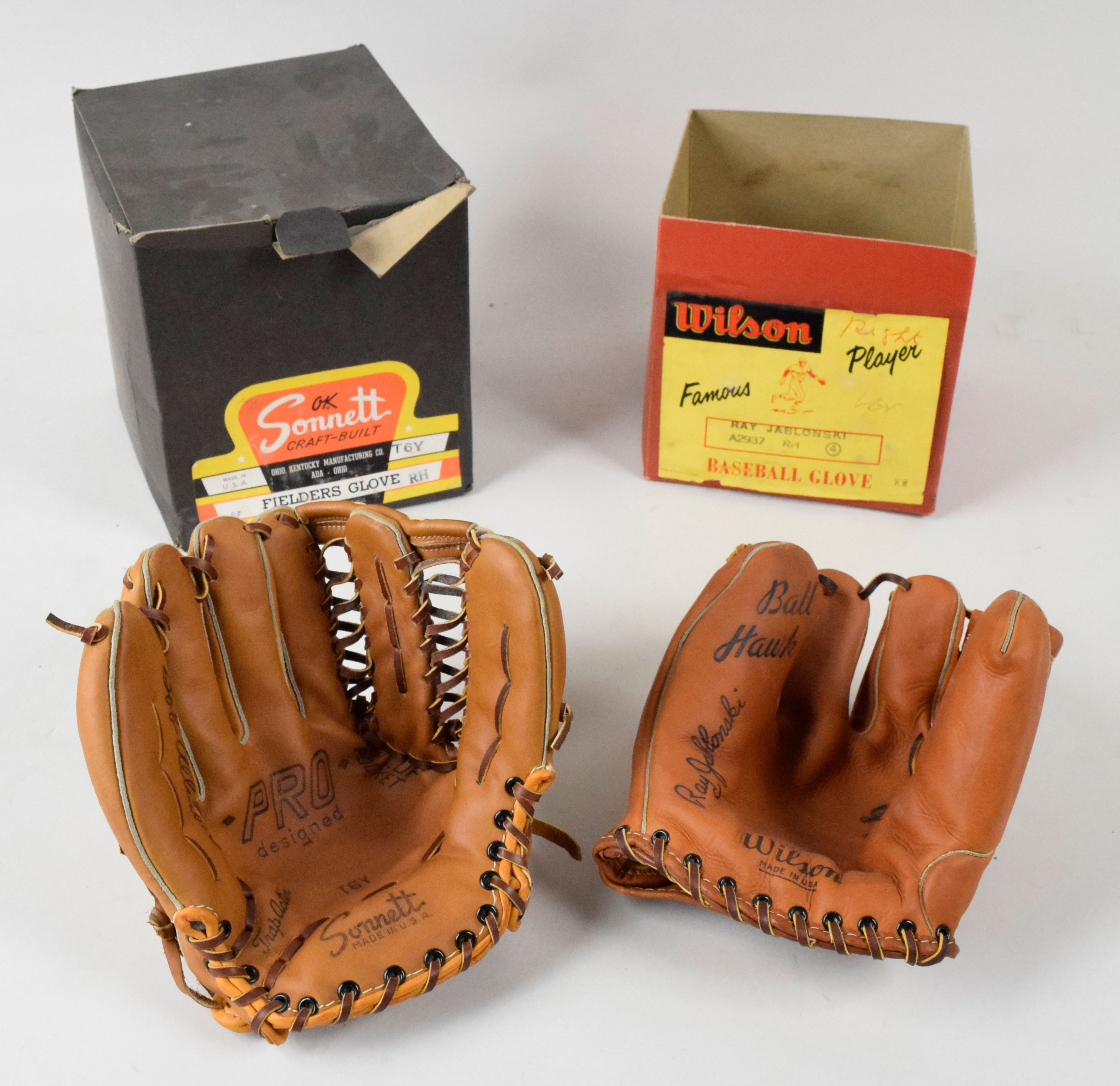 Description:Bob Allison & Ray Jablonski vintage store model baseball gloves with original boxes, c.1950s-60s (gloves NM-NM/MT, boxes VG). Includes c.1950s Wilson A2937 Ray Jablonski model glove for left handed thrower (NM unused) with original box (VG missing lid), and c.1960s Sonnett T6Y Bob Allison model glove for left handed thrower (NM-NM/MT unused) with original box (VG).