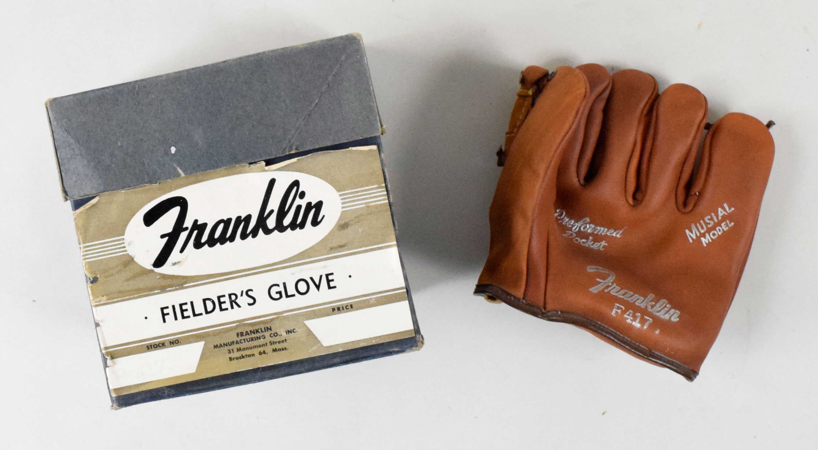 Description:Stan Musial vintage store model baseball glove with original box, c.1950s (glove NM, box VG). Franklin F417 Stan Musial model glove for right handed thrower (NM unused). Original box has some handling and storage wear (VG).