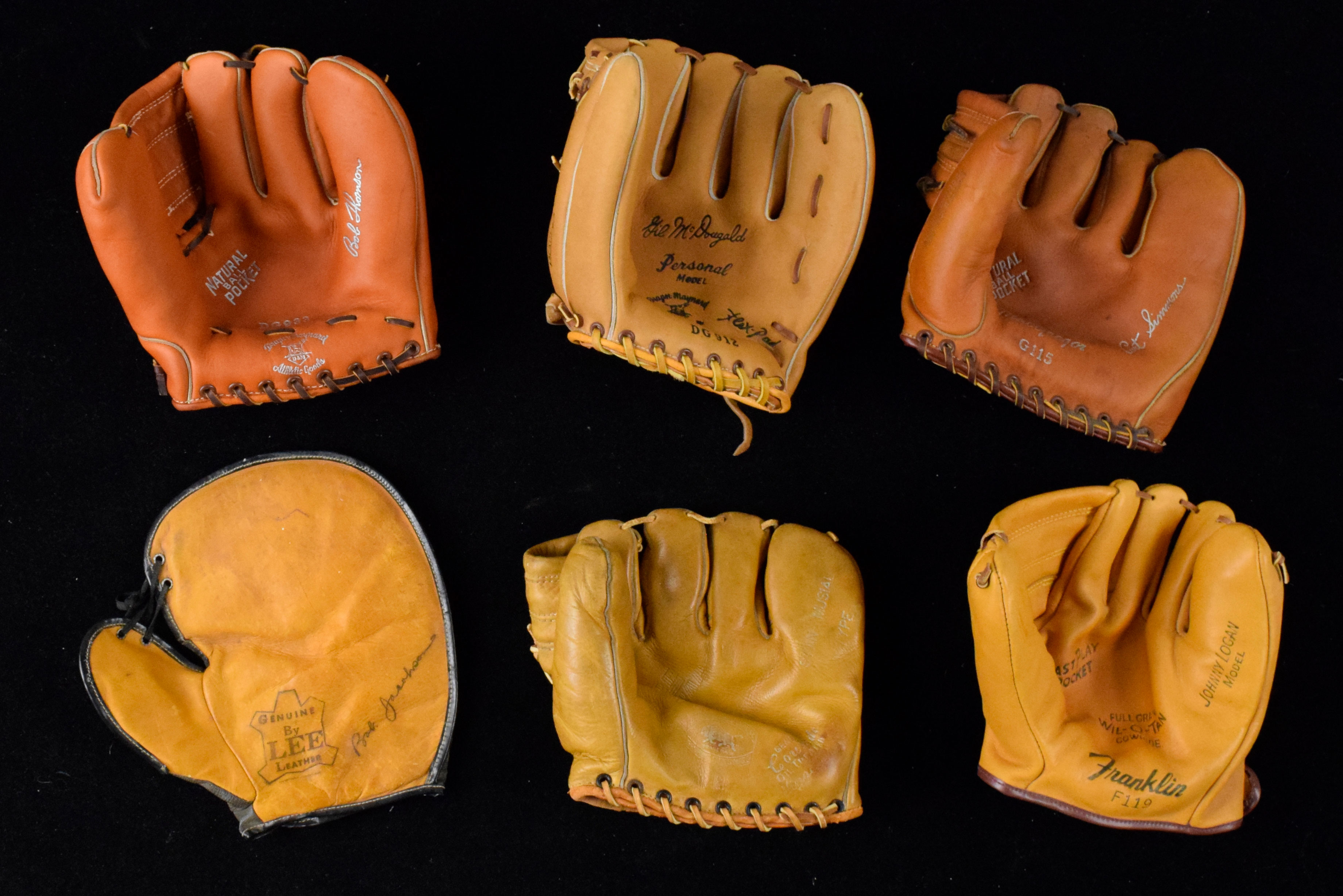Description:Lot of (9) vintage player endorsed store model baseball gloves, c.1920s-60s (VG/EX-NM/MT). Includes c.1920s-30s Lee Leather Bob Jacobson model 1st base mitt for right handed thrower (EX), c.1940s-50s Rawlings Bill Doak model glove for right handed thrower (EX-EX/MT), c.1950s Buffalo Leather Sporting Goods 112 Stan Musial model glove for right handed thrower (VG/EX-EX), c.1950s Caprino A-399 Jackie Robinson model glove for right handed thrower (EX), c.1950s MacGregor G115 Curt Simmons model glove for right handed thrower (EX/MT-NM), c.1950s Draper-Maynard DG912 Gil McDougald model glove for right handed thrower (NM), c.1950s Draper-Maynard DG933 Bob Thomson model glove for right handed thrower (NM), c.mid-late 1950s Franklin F119 Johnny Logan model glove for right handed thrower (NM-NM/MT), and c.1950s-60s Draper-Maynard DG936 Art Ditmar model glove for left handed thrower (EX-EX/MT).