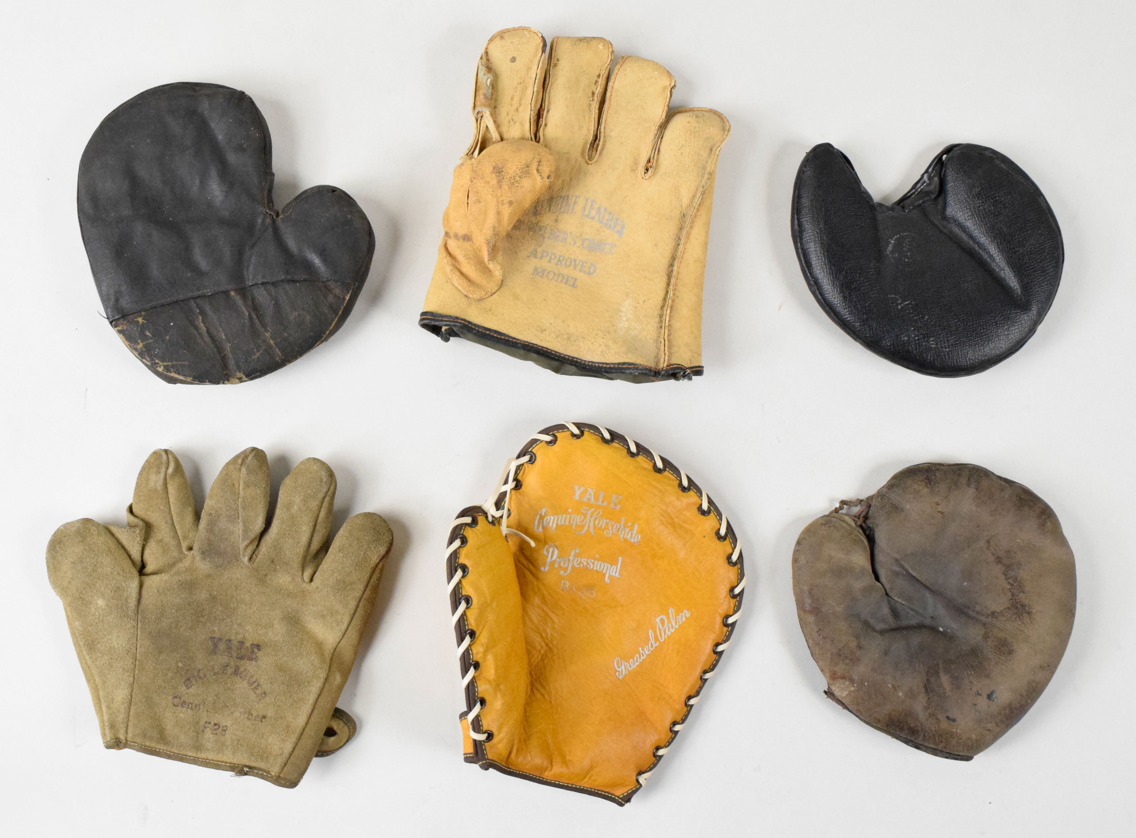 Description:Lot of (12) vintage baseball gloves, c.early 1900s - 1930s (FR/GD-EX/MT). Includes (7) c.early 1900s baseman's mitts (all are low grade except for a youth model), (2) low grade Rawlings 1st base mitts (one is a youth model), Yale 1" web F28 model glove (EX), Yale B125 model 1st base mitt (EX/MT), and (2) other lower grade gloves: FR/GD-EX/MT