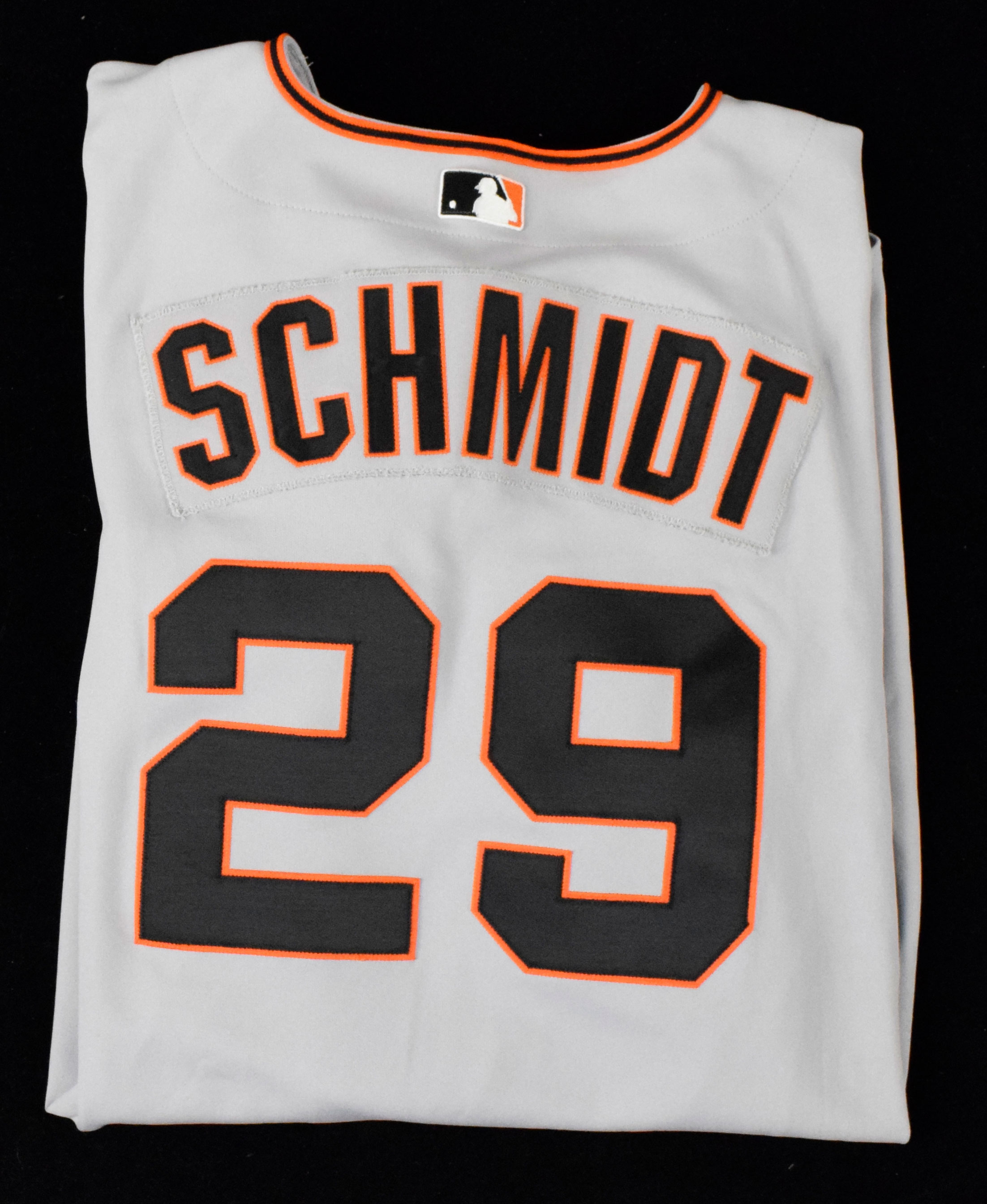 Description:Jason Schmidt professional model San Francisco Giants jersey, c.2002 (EX/MT). Russell Athletic MLB Authentic Collection size 52 jersey with "SAN FRANCISCO" sewn across the front, along with "SCHMIDT" nameplate and #29 sewn on the back. Giants logo patch is sewn on the left sleeve, and Russell Athletic tag is on the front tail with size and extra length flag tags attached. Light overall use/wash wear: EX/MT