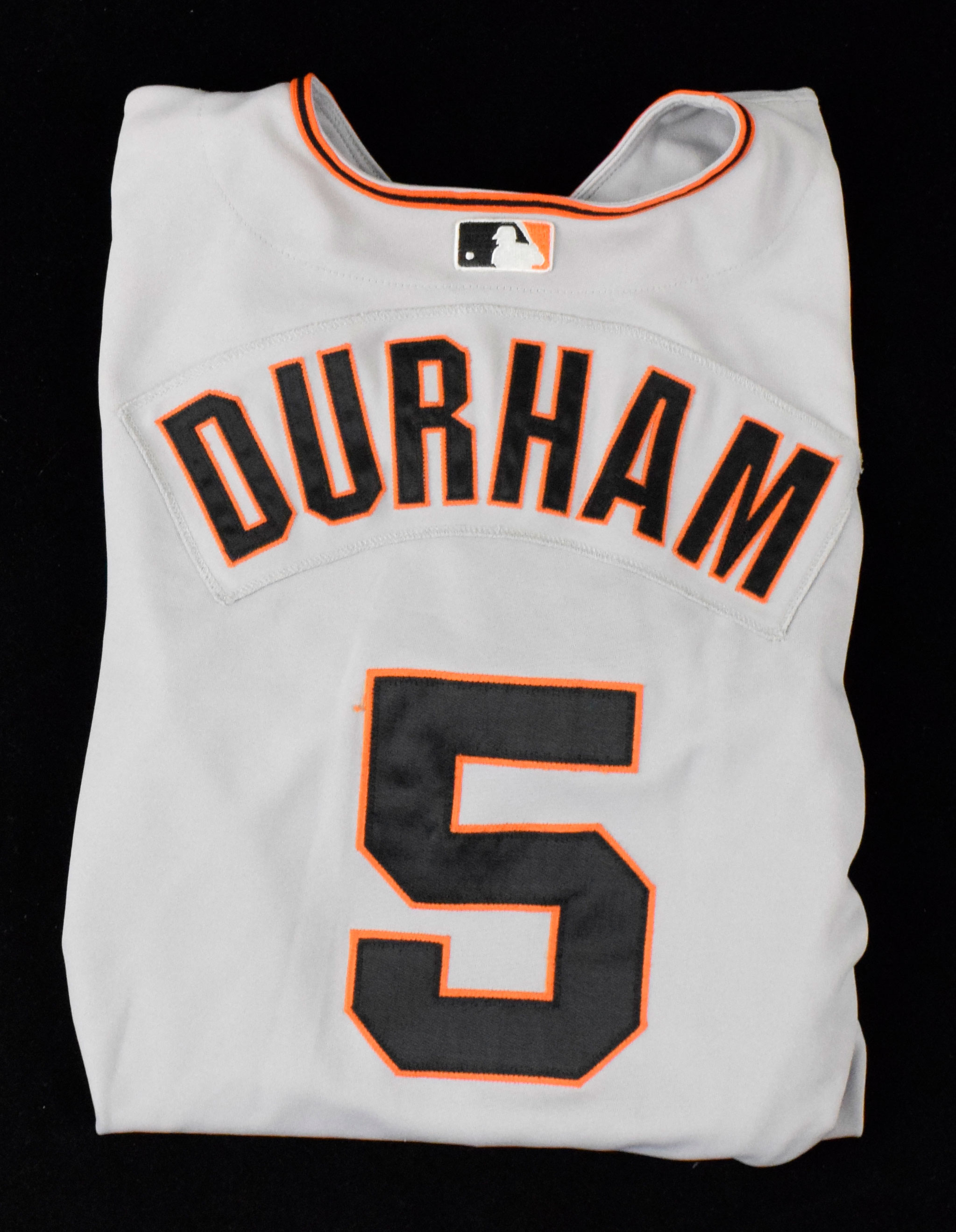 Description:2003 Ray Durham professional model San Francisco Giants jersey with Bobby Bonds memorial patch (EX). Russell Athletic MLB Authentic Collection size 46 Giants #5 Ray Durham jersey with "BB" Bobby Bonds memorial patch sewn on the right sleeve, and "PURCHASED FROM THE SAN FRANCISCO GIANTS" stamp inside the front tail. Small spots of fabric pilling, and curling to the flag tags associated with multiple washings: EX