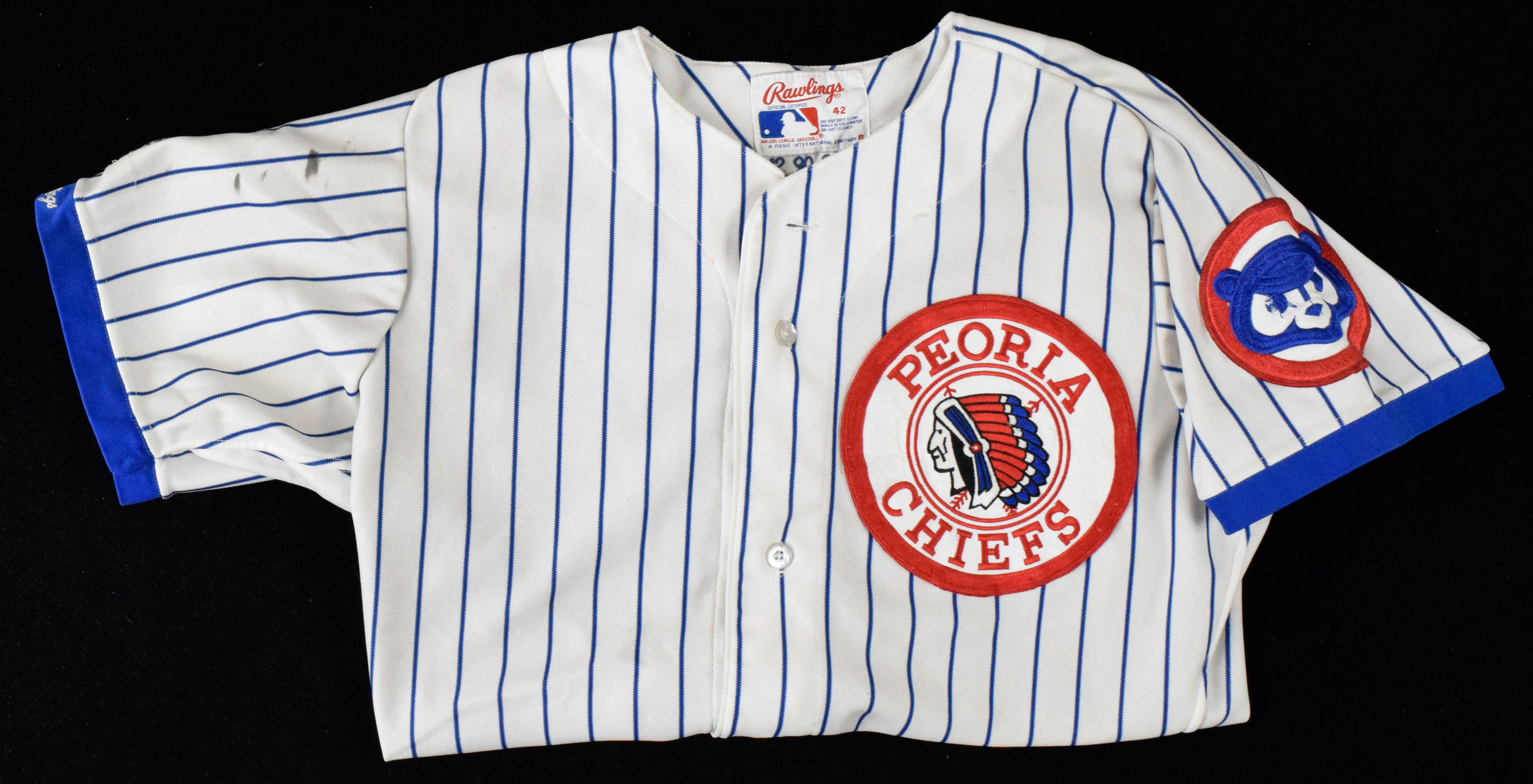Description:Peoria Chiefs professional model jersey, c.1990-91 (EX). Rawlings size 42 Peoria Chiefs #2 jersey with "12 90 2 42" strip tag sewn inside the collar, and 1991 Peoria Area Tricentennial patch sewn on the right sleeve. Evidence of number change on the back (along with 1990 strip tag and 1991 patch) likely indicates the jersey was used by a player #12 in 1990 (possibly Shawon Dunston if a Cubs jersey sent to the minors for use) and then reissued for use by a player #2 for the Chiefs in 1991. Very nice use with some scattered stains: EX