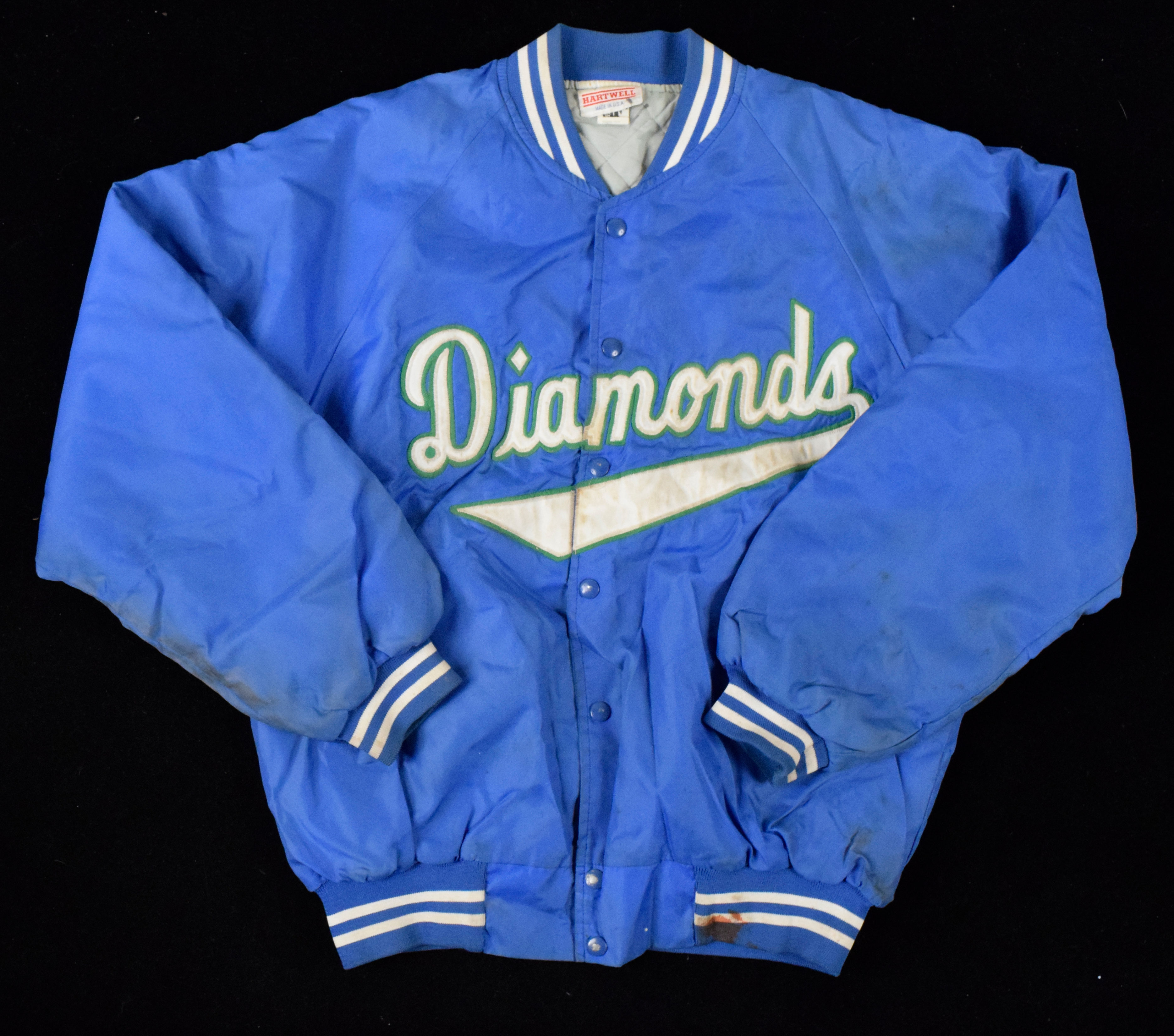 Description:Waterloo Diamonds professional model jacket, c.1989-93 (EX). Hartwell size L Diamonds jacket with some scribbles in black marker on the tag (possibly player name). Heavy use with stains on the front, sleeves, and tail: EX