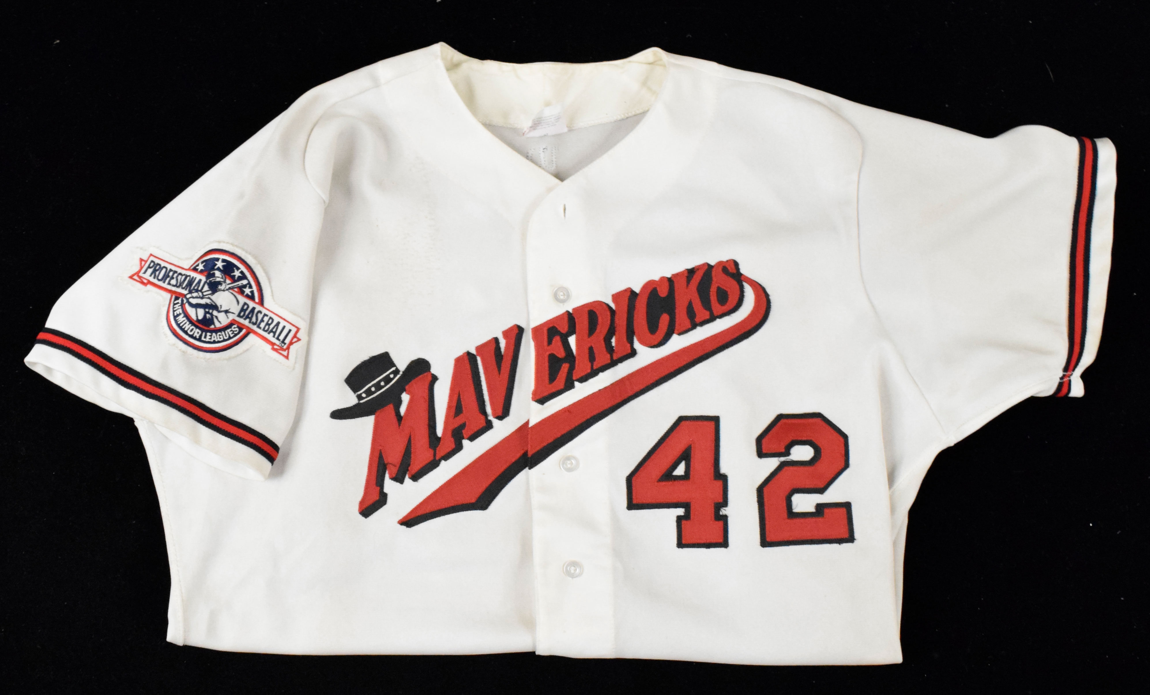 Description:High Desert Mavericks professional model jersey attributed to Darrin Paxton, c.mid 1990s (EX). Wilson size 46 jersey with "Mavericks" and #42 sewn on the front, along with "PAXTON" nameplate and #42 sewn on the back. The Minor Leagues patch is sewn on the right sleeve, and Wilson tag is inside the collar. Very nice use with fabric pilling on the front, heavy staining along the left side, and evidence of a nameplate change on the back: EX