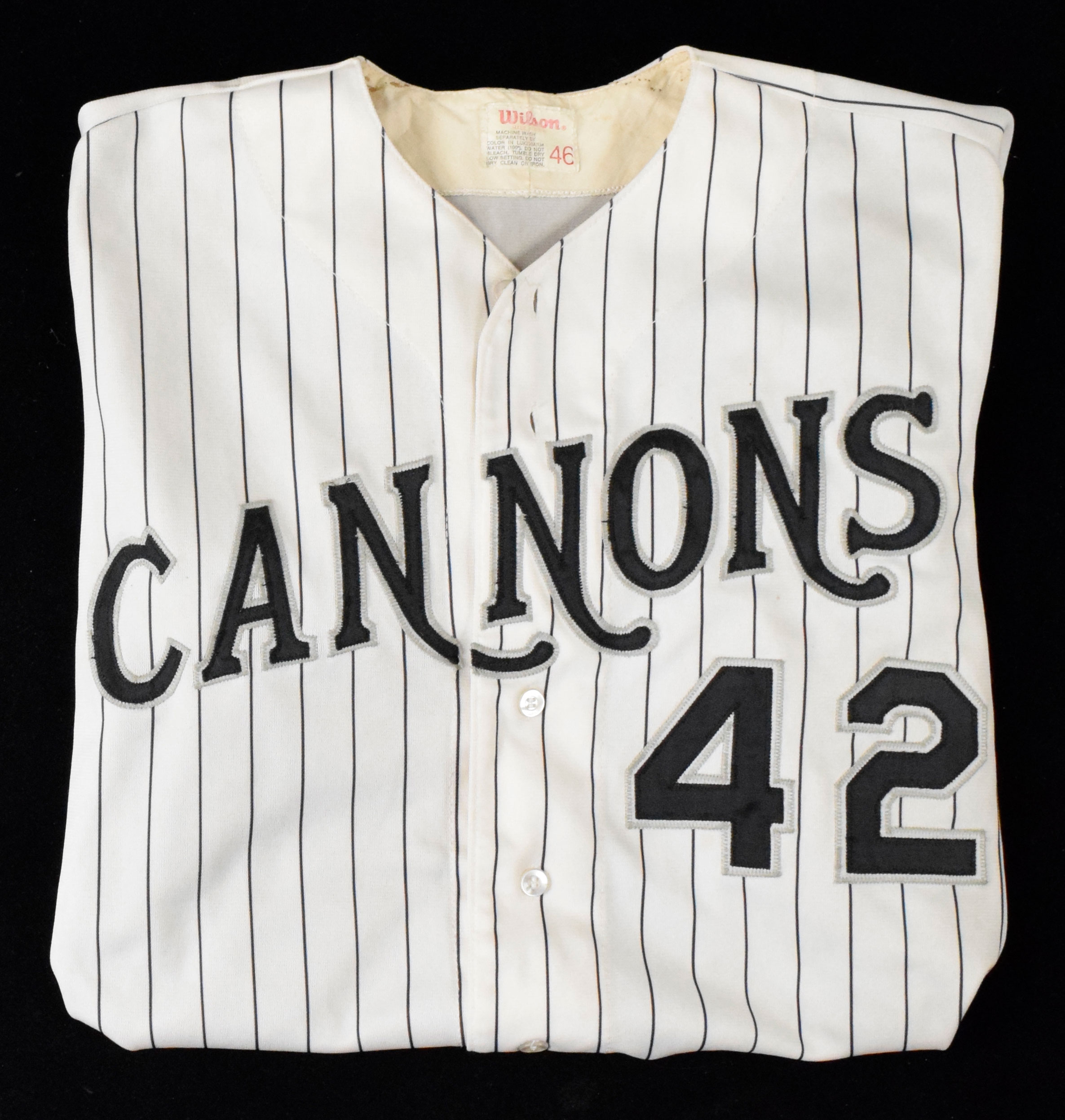 Description:Prince William Cannons professional model jersey, c.mid 1990s (EX). Wilson size 46 jersey with "CANNONS" and #42 sewn on the front, along with #42 sewn on the back. Wilson tag is inside the collar. Nice use with staining around the collar, and on the left side of the tail: EX