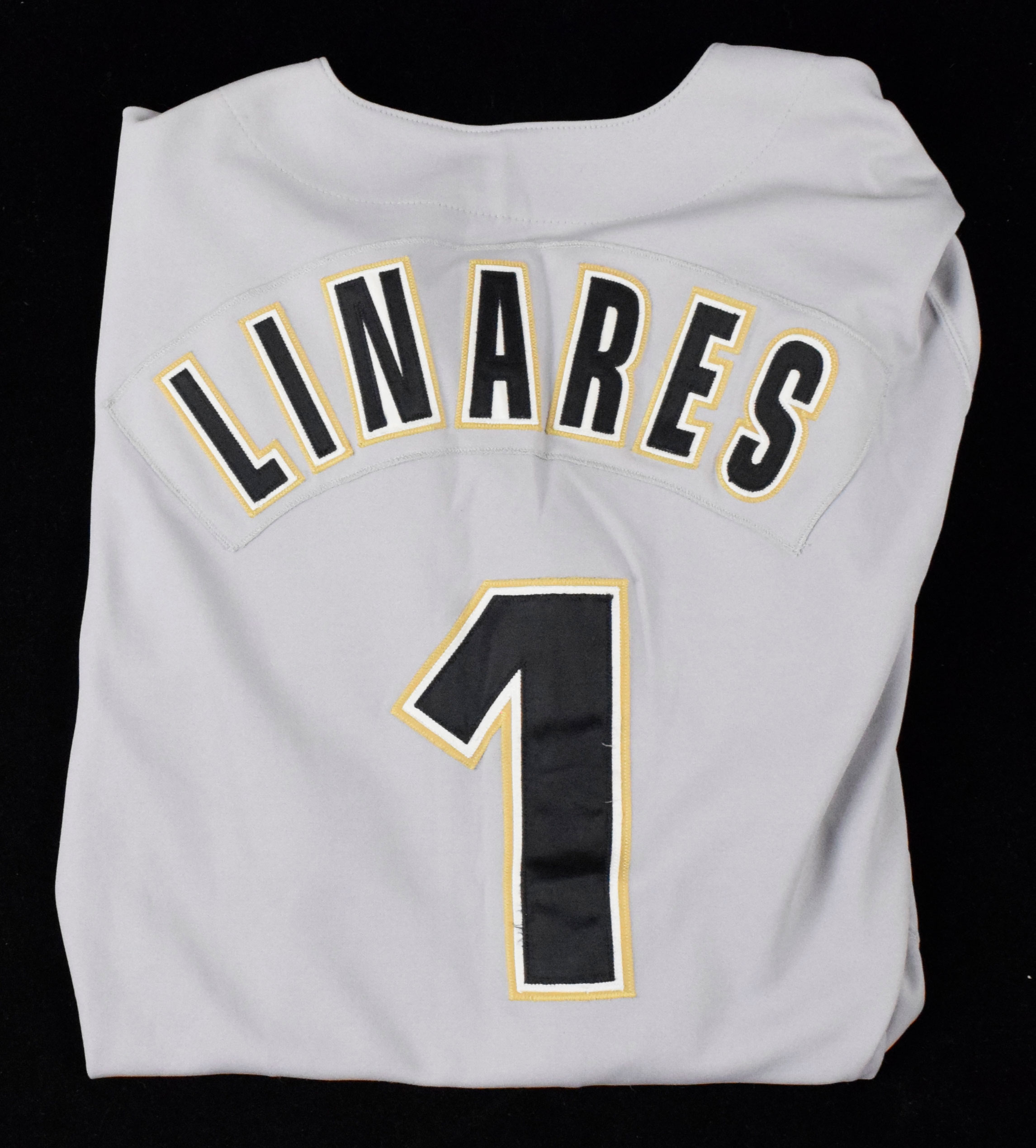 Description:1995 Julio Linares professional model Houston Astros jersey (EX/MT). Russell Athletic MLB Authentic Diamond Collection size 42 jersey with "HOUSTON" sewn across the front, along with "LINARES" nameplate and #1 sewn on the back. Astrodome 30th Anniversary patch is sewn on the left sleeve, and Russell Athletic tag is on the front tail with 100% Polyester flag tag attached. Light overall use/wash wear: EX/MT