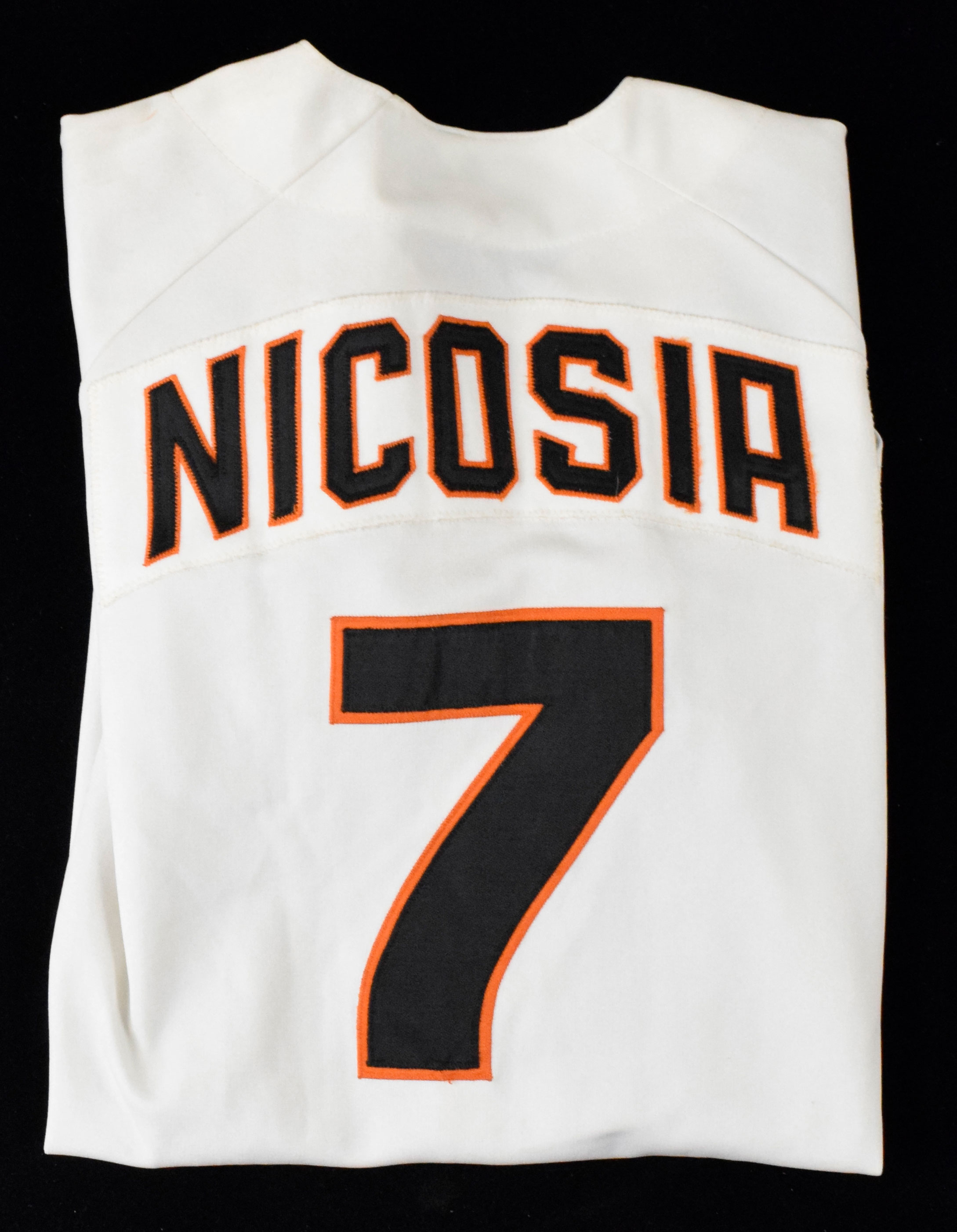 Description:1983 Steve Nicosia professional model San Francisco Giants jersey (EX/MT). Wilson size 42 jersey with "GIANTS" sewn across the front, along with "NICOSIA" nameplate and #7 sewn on the back. Wilson tag is on the front tail, with "7 83" number/year tag sewn below. Light overall use/wash wear: EX/MT