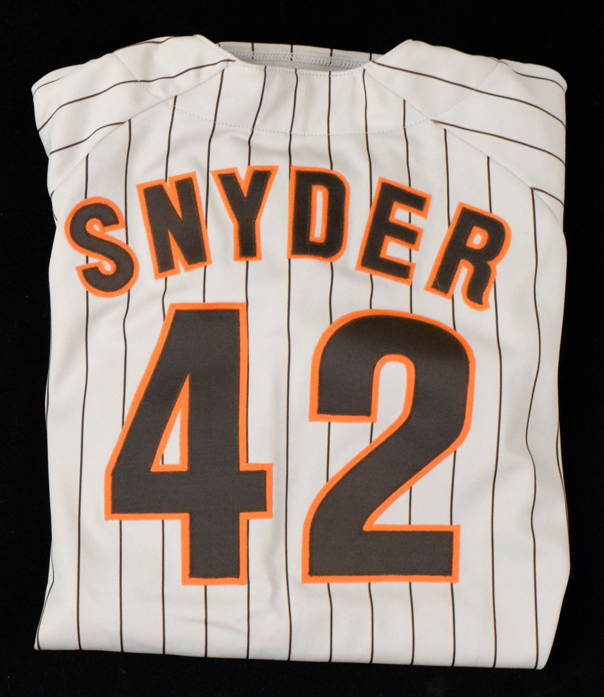 Description:1987 Brian Snyder professional model San Diego Padres jersey (NM). Rawlings size 44 jersey with SD logo sewn on the front, along with "SNYDER" and #42 sewn on the back. Rawlings tag is inside the front tail with "SET 1 1987" flag tag attached, and "2 Inch Extra Length" tag sewn alongside. Snyder did not appear in a MLB game in 1987, and the jersey appears unworn: NM