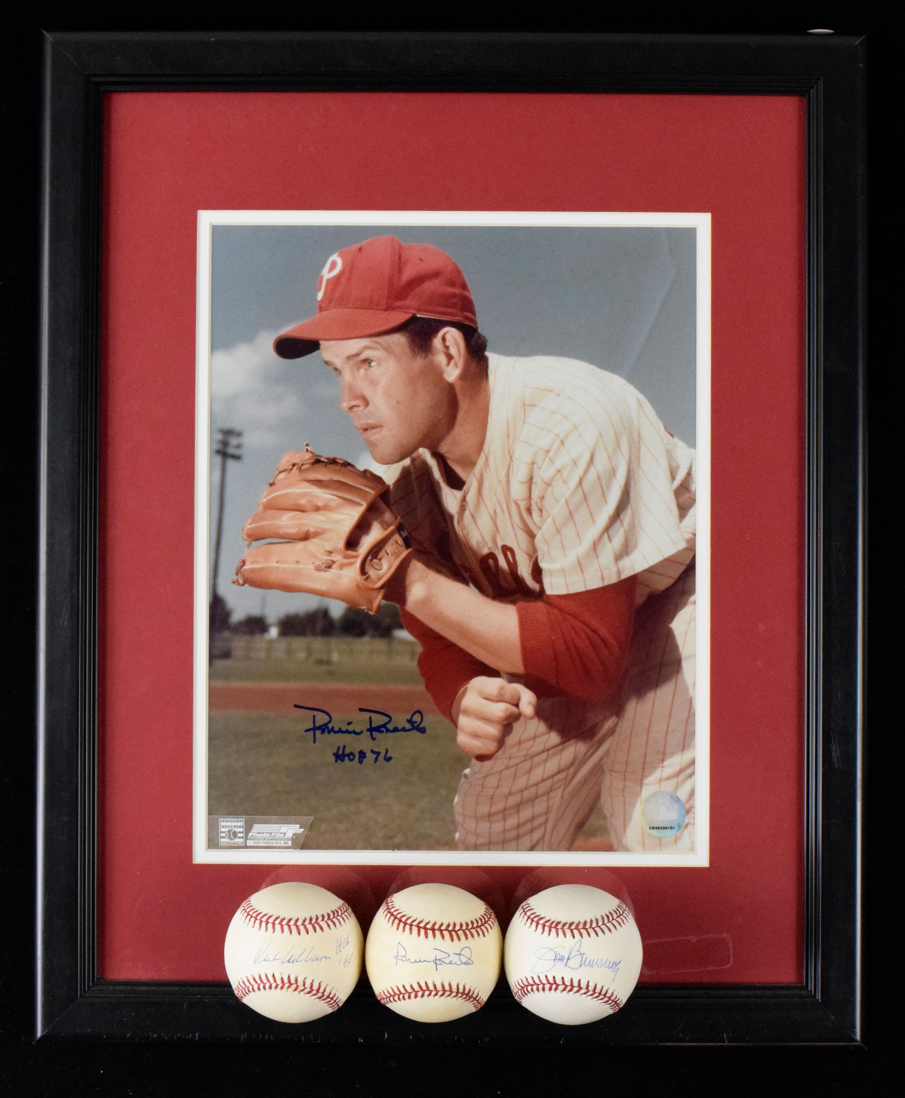 Description:Richie Ashburn, Jim Bunning, and Robin Roberts autograph lot (EX-NM). Includes W.White NL ball (toning) signed by Richie Ashburn with "HOF 95" inscription, G.Budig AL ball (toning) signed by Jim Bunning, L.Coleman NL ball (toning) signed by Robin Roberts, and approx. 18"x21.5" framed photo signed by Robin Roberts with "HOF 76" inscription. Signatures rate 8 to 10 out of 10: EX-NM 24373, 138343, 2100000343157, 2100000325955