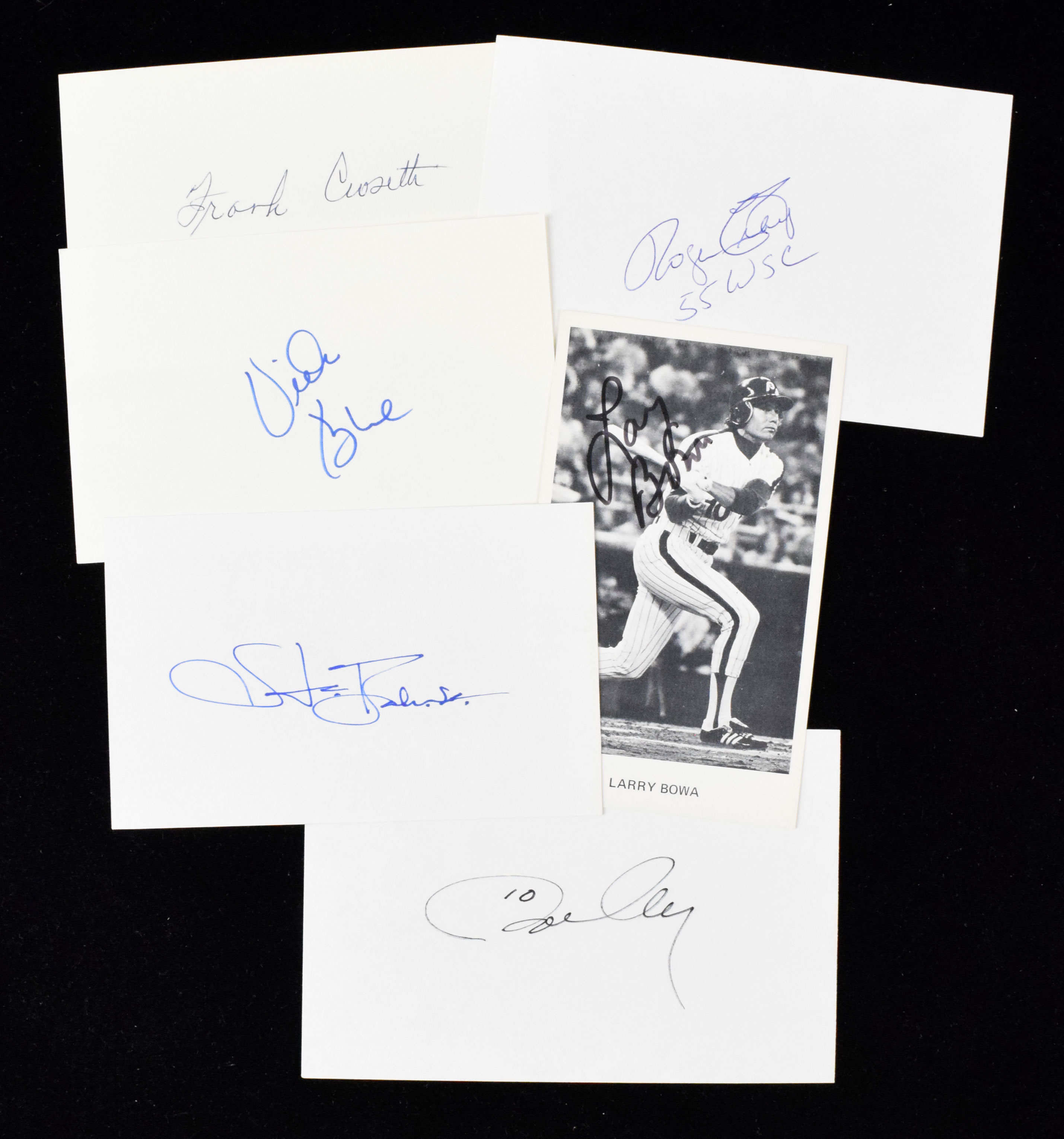 Description:Lot of approx. (250) signed baseball player index cards, including Frank Crosetti and Roger Craig (Sigs. NM). Substantial quantity of larger-size signed index cards and other items (with some duplication) featuring vintage and modern baseball players/officials, including many deceased. Cards are lined and unlined, some with photos and/or captions and some without. Lot includes player last names starting with A, B and C. Highlights include Johnny Antonelli, Larry Anderson, Joe Altobelli, Ruben Amaro, Earl Averill Jr., Larry Bowa, Mark Belanger, Jim Bouton, Bob Boone, Hank Bauer, Lou Burdette, Gates Brown, Brett Butler, Vida Blue, Stan Bahnsen, Steve Balboni, Ron Cey, Roger Craig, Horace Clarke, Johnny Callison, Rick Cerone, Frank Crosetti and many more. Signatures rate 7/8 out of 10. Please note: This lot is from an extensive collection of autographs and the quantity does not allow for our normal authenticity screening process. While we feel that the bulk of what is being offered is authentic, it should be assumed that there are at least some secretarial and/or otherwise non-authentic signatures mixed in. Most index cards appear EX or better.