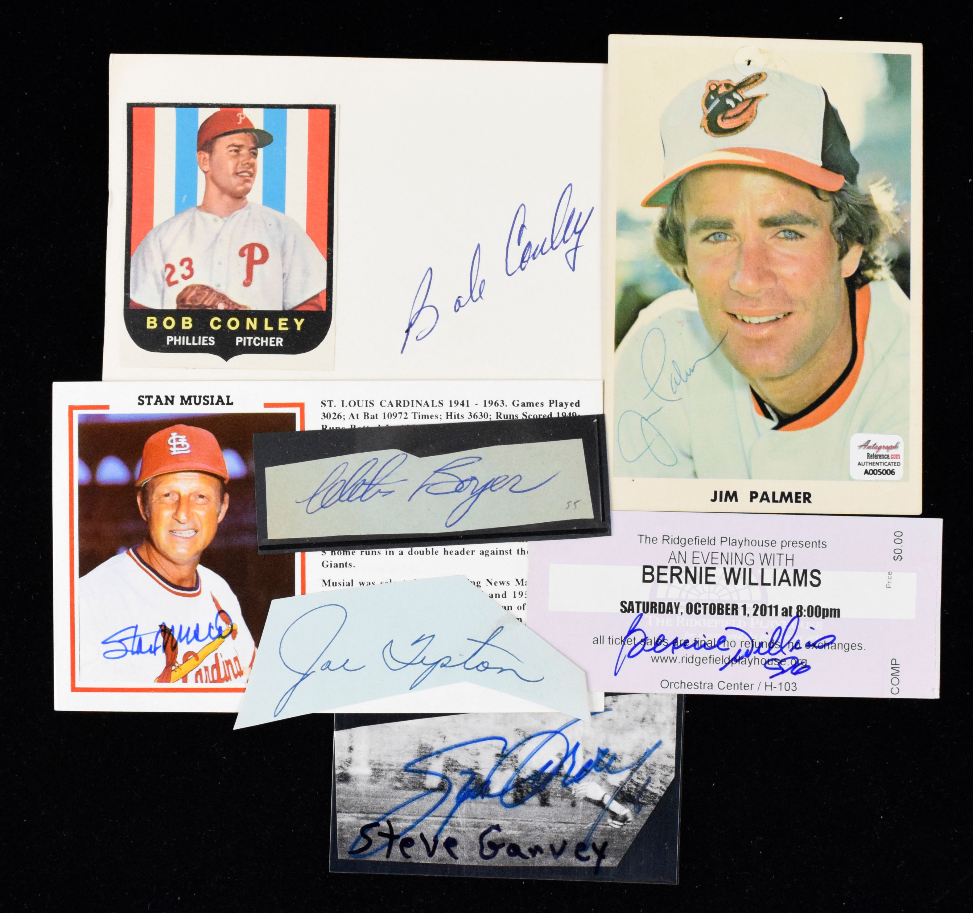 Description:Lot of approx. (120+) baseball cut signatures and other items, including Stan Musial and Jim Palmer (Sigs. NM). Substantial quantity (with duplication) of cut signatures, photographs and other signed items (with some duplication plus one unsigned 1954 George Eastman first day cover) featuring vintage and modern baseball players/officials, including many deceased. Highlights include Cookie Lavagetto, Steve Garvey, Joe Black, Virgil Trucks, Ted Beard, Earl Battey, Ralph Terry, Bob Oldis, Bernie Williams, Stan Musial, Clete Boyer, Gene Woodling, Jim Palmer, Walt Dropo, Wilbert Hubbell, Joe Tipton, Bob Conley and many more. Signatures rate 7/8 out of 10. Please note: This lot is from an extensive collection of autographs and the quantity does not allow for our normal authenticity screening process. While we feel that the bulk of what is being offered is authentic, it should be assumed that there are at least some secretarial and/or otherwise non-authentic signatures mixed in. Most items appear VG-VG/EX.