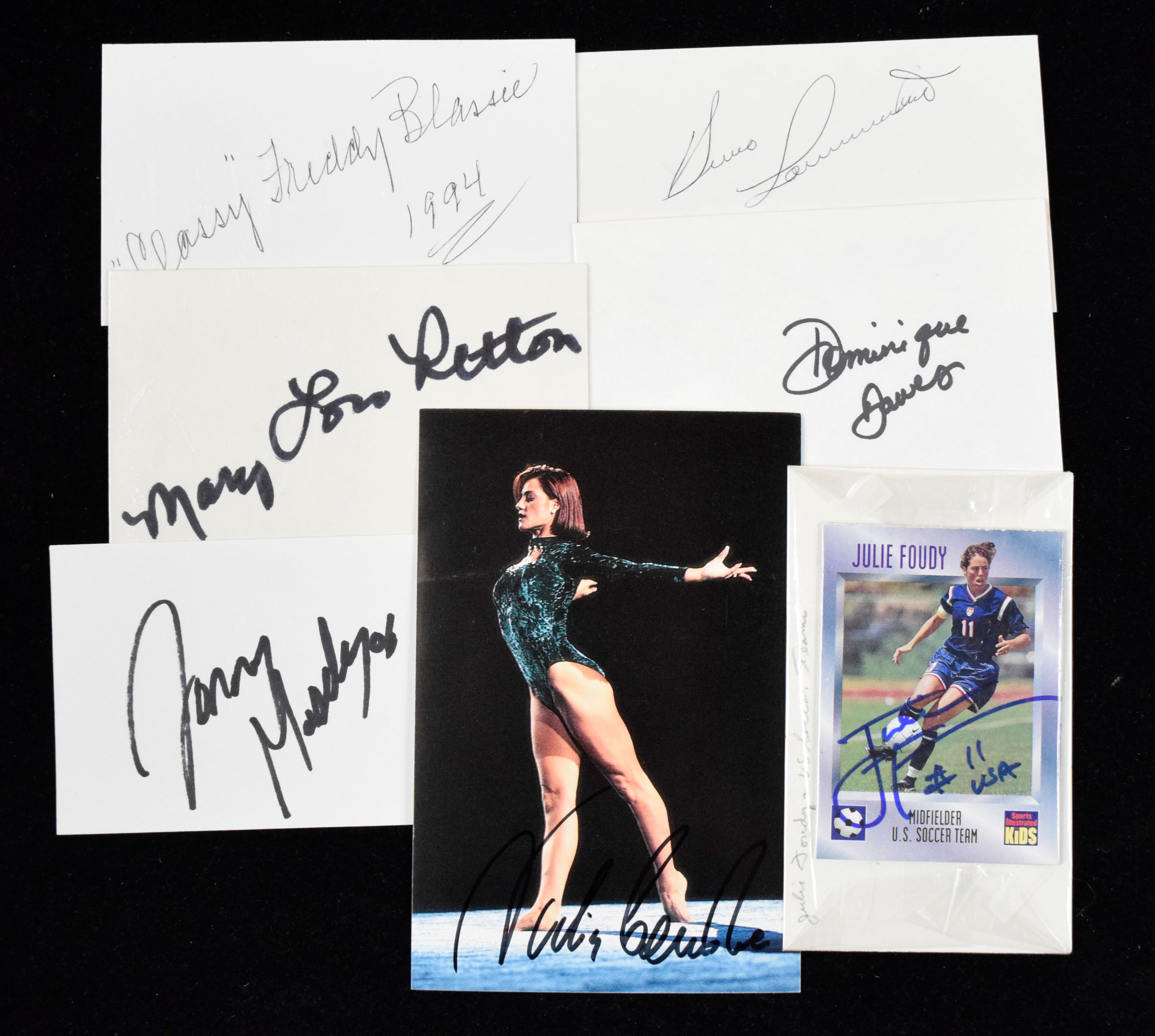 Description:Lot of approx. (150+) Olympian and wrestler signed index cards, including Mary Lou Retton and Nadia Comaneci (Sigs. NM). Substantial quantity (with duplication) of signed index cards, cut signatures and other items, featuring primarily Olympians, wrestlers, soccer players and college athletes. Cards are lined and unlined, some with photos and/or captions and some without. Highlights include Julie Smith, Bruno Sammartino, Julie Foudy, Classy Freddie Blassie, Jonny Moseley, Pirmin Zurbriggen, Bart Conner, Dominique Dawes, Shannon Miller, Martha Karolyi, Mitch Gaylord, Nadia Comaneci, Peter Vidmar, Mary Lou Retton and many more. Signatures rate 7/8 out of 10. Please note: This lot is from an extensive collection of autographs and the quantity does not allow for our normal authenticity screening process. While we feel that the bulk of what is being offered is authentic, it should be assumed that there are at least some secretarial and/or otherwise non-authentic signatures mixed in. Most index cards appear EX or better.