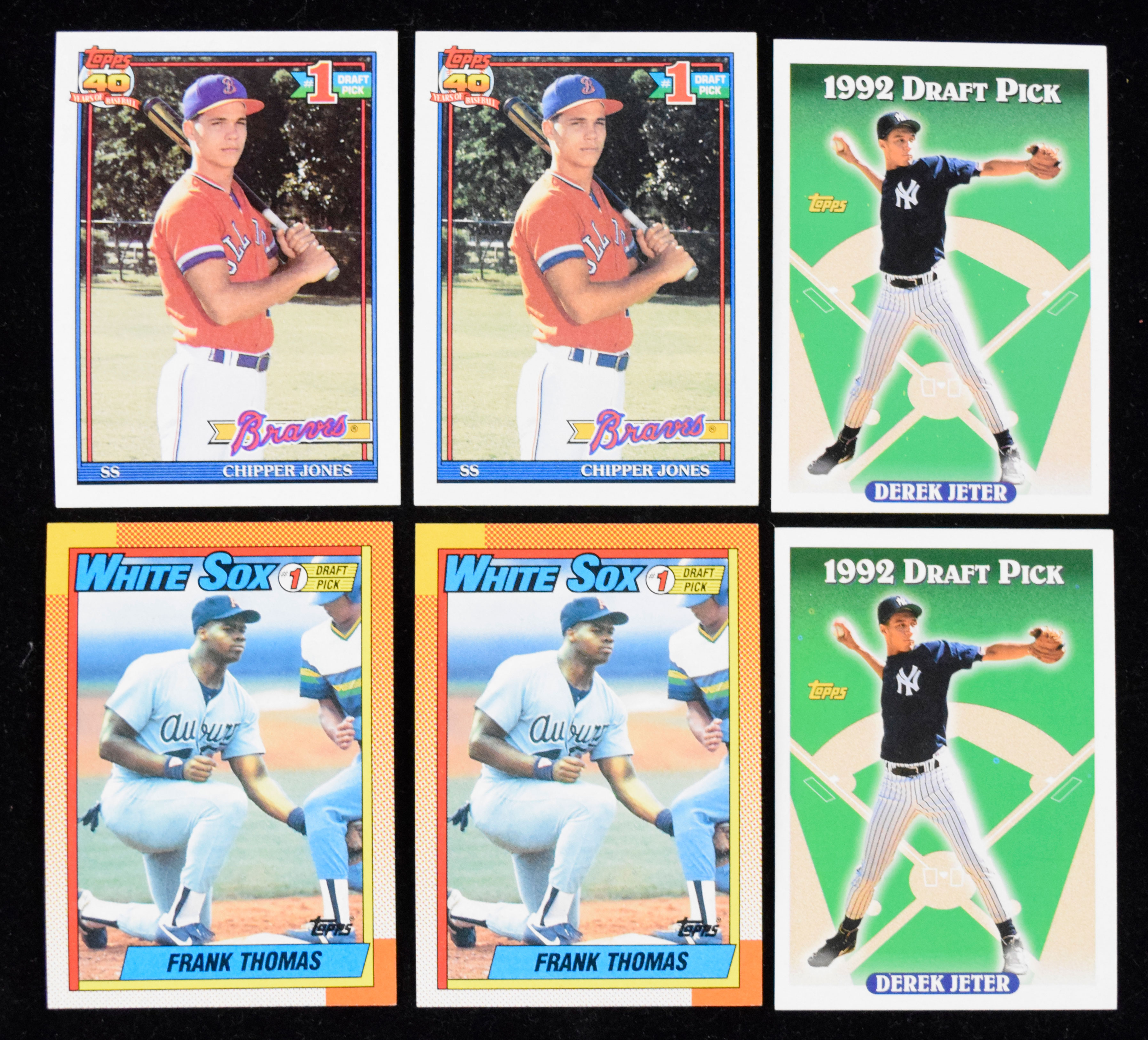 Description:Lot of (12) 1988-1994 Topps complete sets, including (2) 1993 Topps with Derek Jeter RC (EX-MT). Nice quantity of Topps hand-collated sets, with (2) 1988, (2) 1989, (2) 1990, (2) 1991, (2) 1993 and (2) 1994. Good selection of RCs in these years, including Frank Thomas, Derek Jeter, Chipper Jones, Tom Glavine and more. Most cards appear NM-NM/MT or better, with a few less here and there. Range: EX-MT.