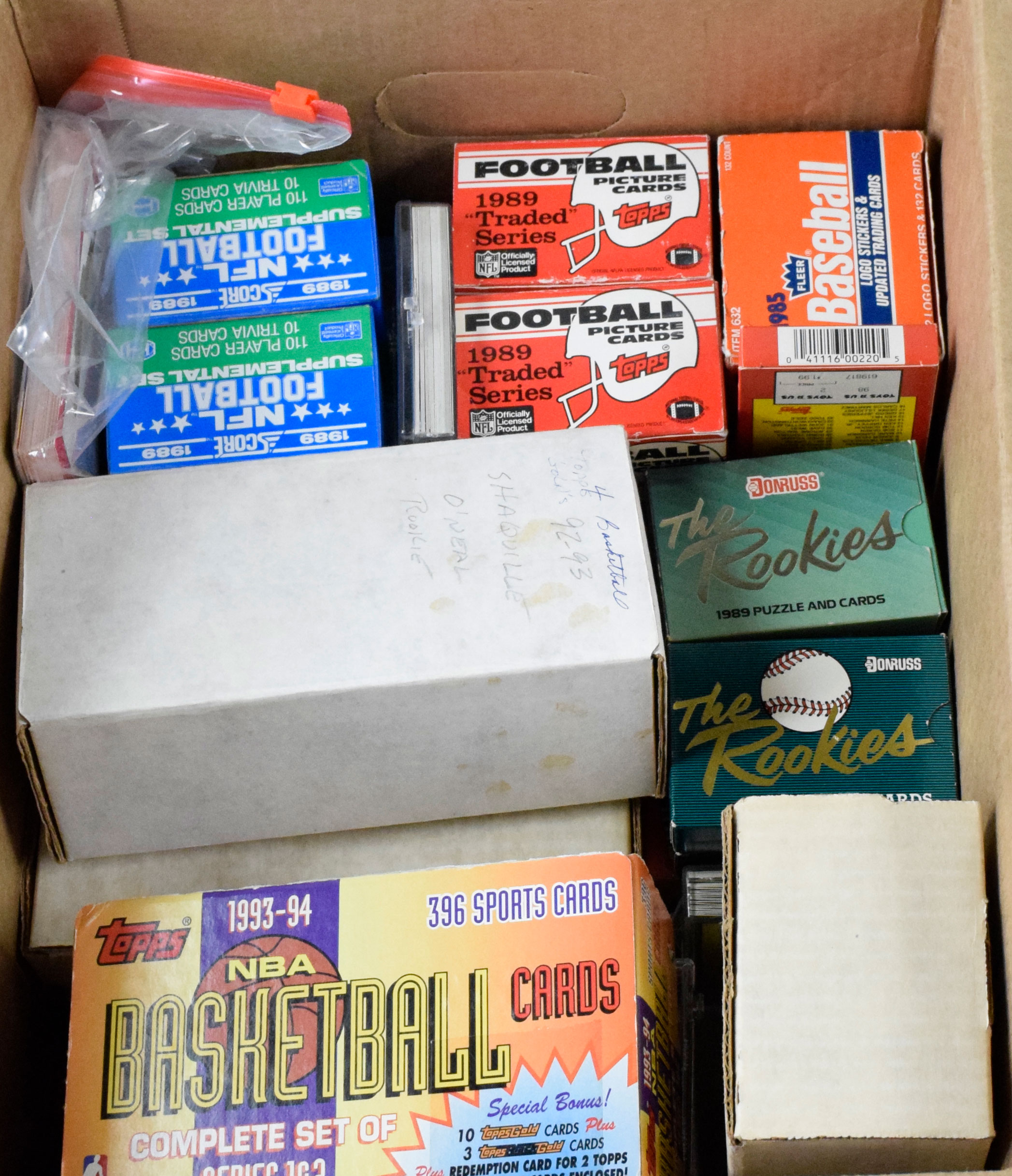 Description:Box of mixed sports card sets, including 1992-93 Topps Gold basketball and (2) 1989 Topps Traded football (NM-NM/MT). Nice assortment of baseball, football and basketball card sets with excellent breakdown value, including Traded and Update sets. Highlights include (2) 1986 Donruss the Rookies sets (one sealed; one unsealed); 1987 and 1989 Donruss the Rookies sets (both unsealed); (2) 1989 Topps Traded Football sets; (2) 1989 Score Supplemental football sets; (1) 1990 Topps football factory set (sealed); (1) 1989 Action Packed NFL set; (1) 1992-1993 Topps Gold hand-collated basketball set with #362 Shaquille O'Neal RC; (1) 1993-94 Topps basketball open factory set; (3) 1992 Impel U.S. Olympic card sets; (1) 1985 Fleer Update baseball set; 1988, 1989, and 1991 Topps baseball complete hand-collated sets and more. Some boxes show wear but most cards appear NM-NM/MT or better.
