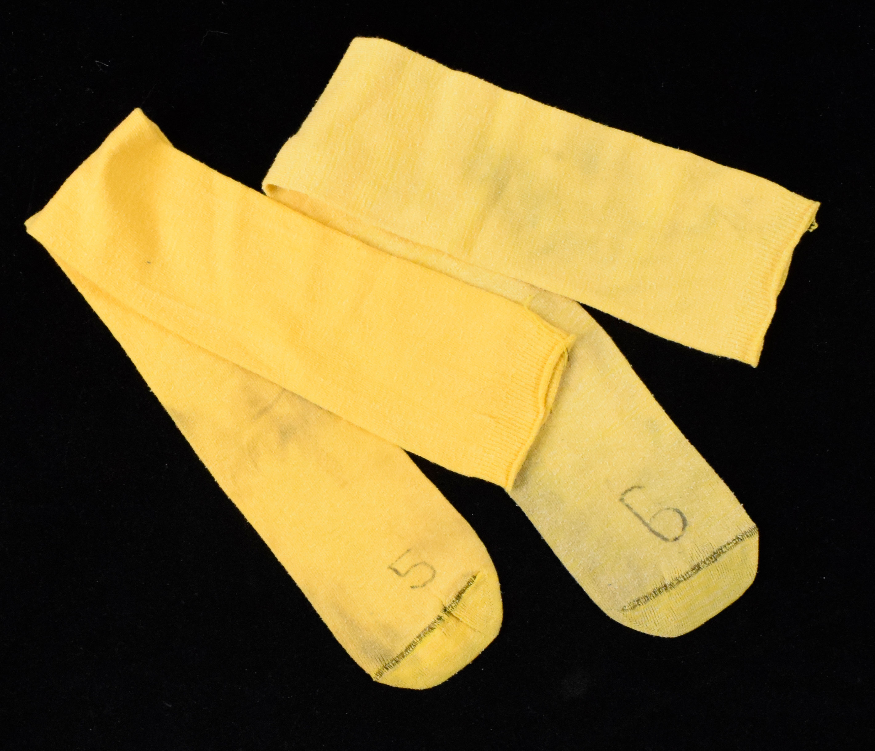 Description:Two Oakland A's gold sanitary socks attributed to Joe DiMaggio and Reggie Jackson, c. late 1960s (EX). Interesting and seldom-offered pairing of socks attributed to the Oakland A's, circa 1968-1969, when DiMaggio was the team's hitting coach and Jackson was just beginning his Hall of Fame career. One sock is marked "9" at the toe (Jackson's number), while the other is marked "5" (DiMaggio's number). Both are well-preserved despite evidence of strong use/wear and soiling. Included is a COA from our consignor stating the socks were originally obtained from longtime A's and Giants memorabilia dealer Dick Dobbins, who obtained them from the A's: EX.
